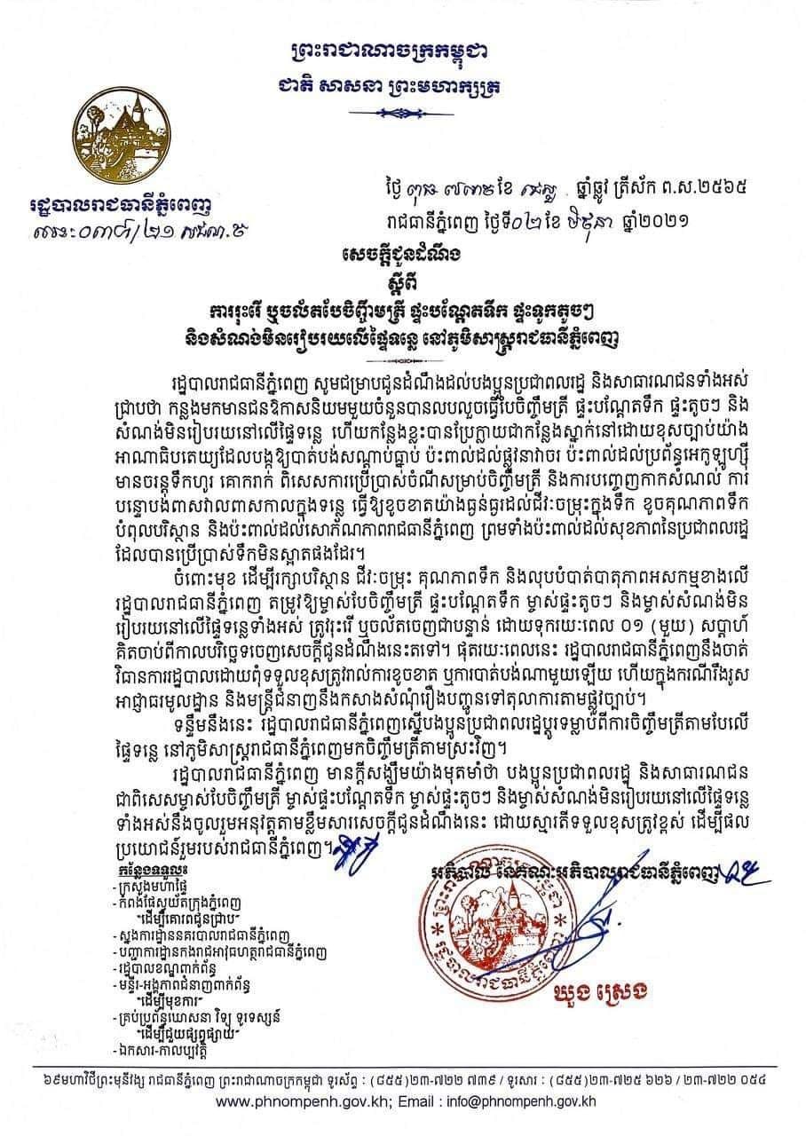 ចំពោះមុខ ដើម្បីរក្សាបរិស្ថាន ជីវៈចម្រុះ គុណភាពទឹក និងលុបបំបាត់បាតុភាពអសកម្មខាងលើ រដ្ឋបាលរាជធានីភ្នំពេញតម្រូវឱ្យម្ចាស់បែចិញ្ចឹមត្រី ផ្ទះបណ្តែតទឹក ម្ចាស់ផ្ទះតូចៗ និងម្ចាស់សំណង់មិនរៀបរយនៅលើផ្ទៃទន្លេទាំងអស់ ត្រូវរុះរើ ឬចល័តចេញជាបន្ទាន់ដោយទុករយៈពេល 1 (មួយ) សប្ដាហ៍ គិតចាប់ពីកាលបរិច្ឆេទចេញសេចក្តីជូនដំណឹងនេះតទៅ។ ផុតរយៈពេលនេះ រដ្ឋបាលរាជធានីភ្នំពេញនឹងចាត់ វិធានការរដ្ឋបាលដោយពុំទទួលខុសត្រូវរាល់ការខូចខាត ឬការបាត់បង់ណាមួយឡើយ ហើយក្នុងករណីរឹងរូស អាជ្ញាធរមូលដ្ឋាន និងមន្ត្រីជំនាញនឹងកសាងសំណុំរឿងបញ្ជូនទៅតុលាការតាមផ្លូវច្បាប់។ ទន្ទឹមនឹងនេះ រដ្ឋបាលរាជធានីភ្នំពេញស្នើបងប្អូនប្រជាពលរដ្ឋប្តូរទម្លាប់ពីការចិញ្ចឹមត្រីតាមបែលើផ្ទៃទន្លេនៅភូមិសាស្ត្ររាជធានីភ្នំពេញមកចិញ្ចឹមត្រីតាមស្រះវិញ។