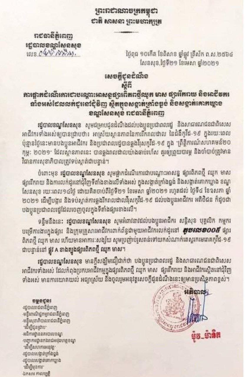 ជាមួយគ្នានេះ រដ្ឋបាលខណ្ឌសែនសុខ បានអំពាវនាវដល់អាជីវករ សន្ដិសុខ បុគ្គលិក កម្មករបម្រើការងារក្នុងផ្សារ និងក្រុមគ្រួសារអាជីវករពាក់ព័ន្ធជាមួយអាជីវករលក់ដូរនៅ តូបលេខ005 ផ្សារពិភពថ្មីឈូកមាស ហើយមានអាការៈសង្ស័យ សូមប្រញាប់រួសរាន់ទៅពិនិត្យសំណាកជាបន្ទាន់នៅ ផ្លូវA ខាងត្បូងផ្សារពិភពថ្មី ឈូកមាស។