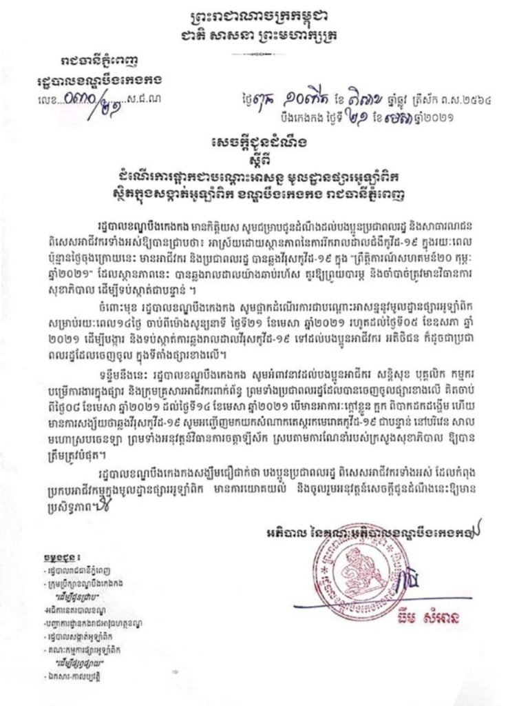 ចំពោះមុខរដ្ឋបាលខណ្ឌបឹងកេងកង សូមផ្អាកដំណើរការជាបណ្ដោះអាសន្ននូវមូលដ្ឋានផ្សារអូឡាំពិក សម្រាប់រយៈពេល14ថ្ងៃ ចាប់ពីម៉ោងសូន្យនាទី ថ្ងៃទី21 ឈានចូលថ្ងៃ22 ខែមេសា ឆ្នាំ2021 រហូតដល់ថ្ងៃទី05 ខែឧសភា ឆ្នាំ2021 ដើម្បីបង្ការ និងទប់ស្កាត់ការឆ្លងរីករាលដាលវីរុសកូវី-19 ទៅដល់បងប្អូនអាជីវករ អតិថិជន ក៏ដូចជាប្រជាពលរដ្ឋដែលចេញចូលក្នុងទីតាំងផ្សារខាងលើ។