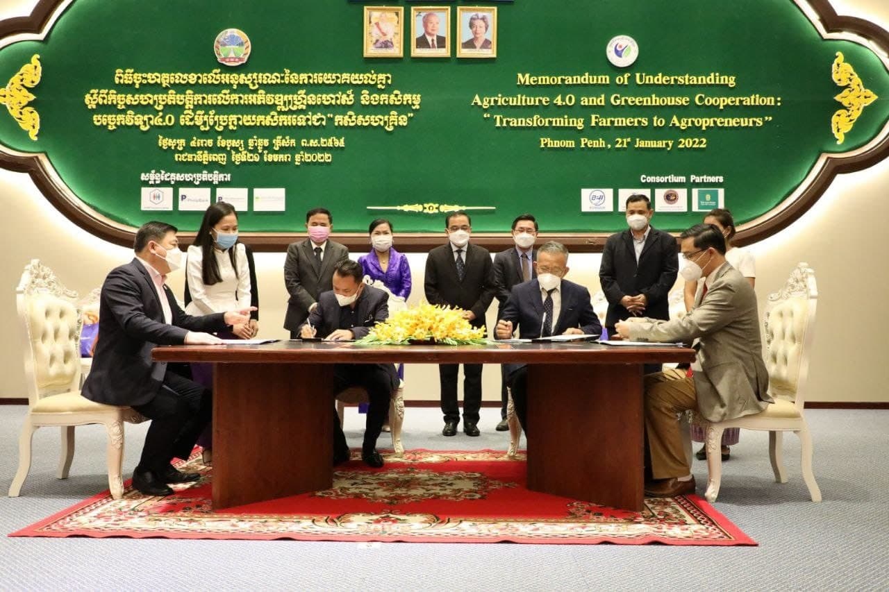 អនុស្សរណ:នៃការយោគយល់គ្នាស្តីពីការអភិវឌ្ឍហ្គ្រីនហៅស៍កសិ-បច្ចេកវិទ្យា ៤.០ ខាងលើនេះ ត្រូវបានក្រសួងកសិកម្ម រុក្ខាប្រមាញ់ និងនេសាទ ចុះហត្ថលេខាជាមួយក្រុមហ៊ុនចំនួន៣ ដែលរួមមាន Agri-Sambathkhmer Co., Ltd ក្រុមហ៊ុន PLMP Venture Capital Co., Ltd និងក្រុមហ៊ុន ISBP Group-Sun Business Investment Globe Co., Ltd កាលពីថ្ងៃចុងសប្ដាហ៍កន្លងទៅនេះ ។