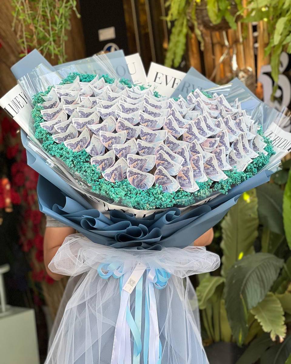 បន្ថែមពីលើនេះ សម្រាប់អ្នកដែលមានធនធានច្រើនគេក៏កម្ម៉ង់ ឬបញ្ជាទិញជាប្រភេទបាច់ផ្កាដែលធ្វើពីក្រដាសប្រាក់តែម្ដង ក្រោមការច្នៃប្រឌិតក្បូរក្បាច់តាមដែលអាចធ្វើទៅបានដូចជា ការបត់ ឬមូ ក្រដាសប្រាក់ឱ្យទៅជារាងប្លែកៗ រួចដាក់ផ្គុំគ្នាជាបាច់ផ្កាលុយរៀល ឬលុយដុល្លារដ៏ស្រស់ស្អាត និងមានតម្លៃសម្រាប់ជូនដល់មនុស្សជាទីស្រឡាញ់របស់ខ្លួនក្នុងថ្ងៃដ៏ពិសេសមួយនេះ។