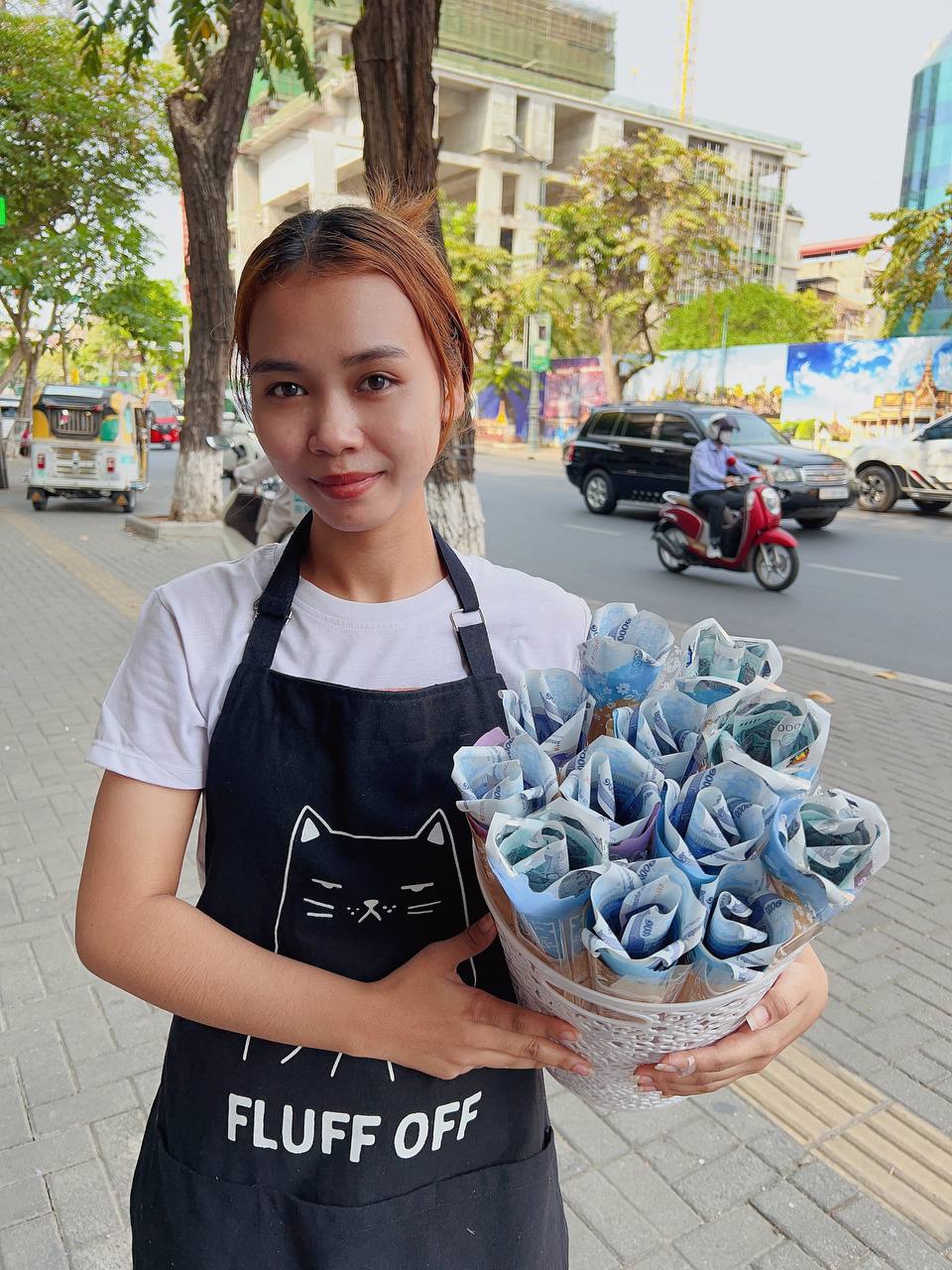 “ក្រៅពីចិត្តស្រឡាញ់អាជីវកម្មនេះហើយ យើងក៏គិតរិះរកគំនិតច្នៃប្រឌិត ក្រៅពីផ្កាស្រស់ដែលមានគេធ្វើយើងហើយ គឺបាច់ផ្កាលុយរៀលដែលជាសិល្បៈម្យ៉ាងដែលអាចច្នៃលុយរៀលទៅជាបែបផែនផ្កាផ្សេងៗគួរឱ្យទាក់ទាញ ហើយសន្លឹកលុយរៀលនេះផ្ទាល់ក៏មានពណ៌ច្រើនដូចជាពណ៌ទឹកក្រូច ក្រហម ខៀវ បៃតងជាដើម ដែលធ្វើឱ្យបាច់ផ្កាកាន់តែមានសម្រស់ស្រស់ត្រកាលបន្ថែមទៀត”