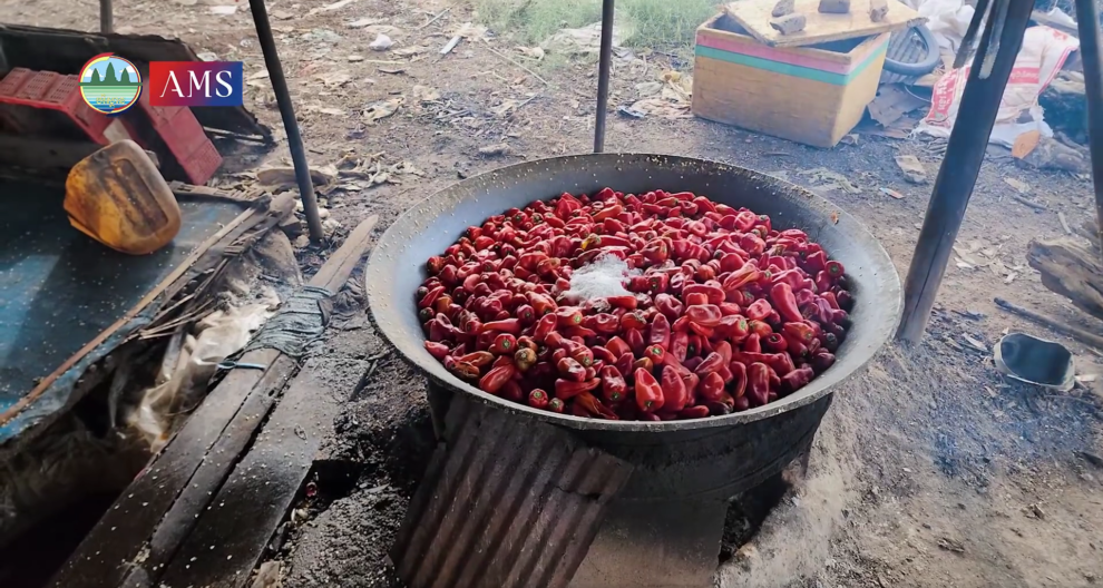 «ក្នុងការផលិតម្ទេសឆ្អើរ ដំបូងយើងទិញម្ទេសស្រស់មកហើយត្រូវជួលឱ្យគេវះក្នុងតម្លៃ ១០០គីឡូក្រាម ចំណាយ ១៥០០០រៀល បន្ទាប់មកយកម្ទេសទៅស្រុះដោយរោយអំបិលខ្លះ លុះពេលស្រុះរួចគេយកម្ទេសទៅដាក់ហាលទើបរោយអំបិលបន្ថែមទៀត ហើយការហាលនេះក៏ត្រូវការជួលកម្លាំងឱ្យគេហាលដែរ។ ដើម្បីឱ្យម្ទេសស្ងួតល្អ គេត្រូវការហាលក្រោមកម្ដៅថ្ងៃប្រមាណ ២-៣ថ្ងៃ បន្ទាប់មកគេរែងយកគ្រាប់ម្ទេសចេញឱ្យស្អាតទើបថ្លឹងច្រកថង់លក់បាន»។