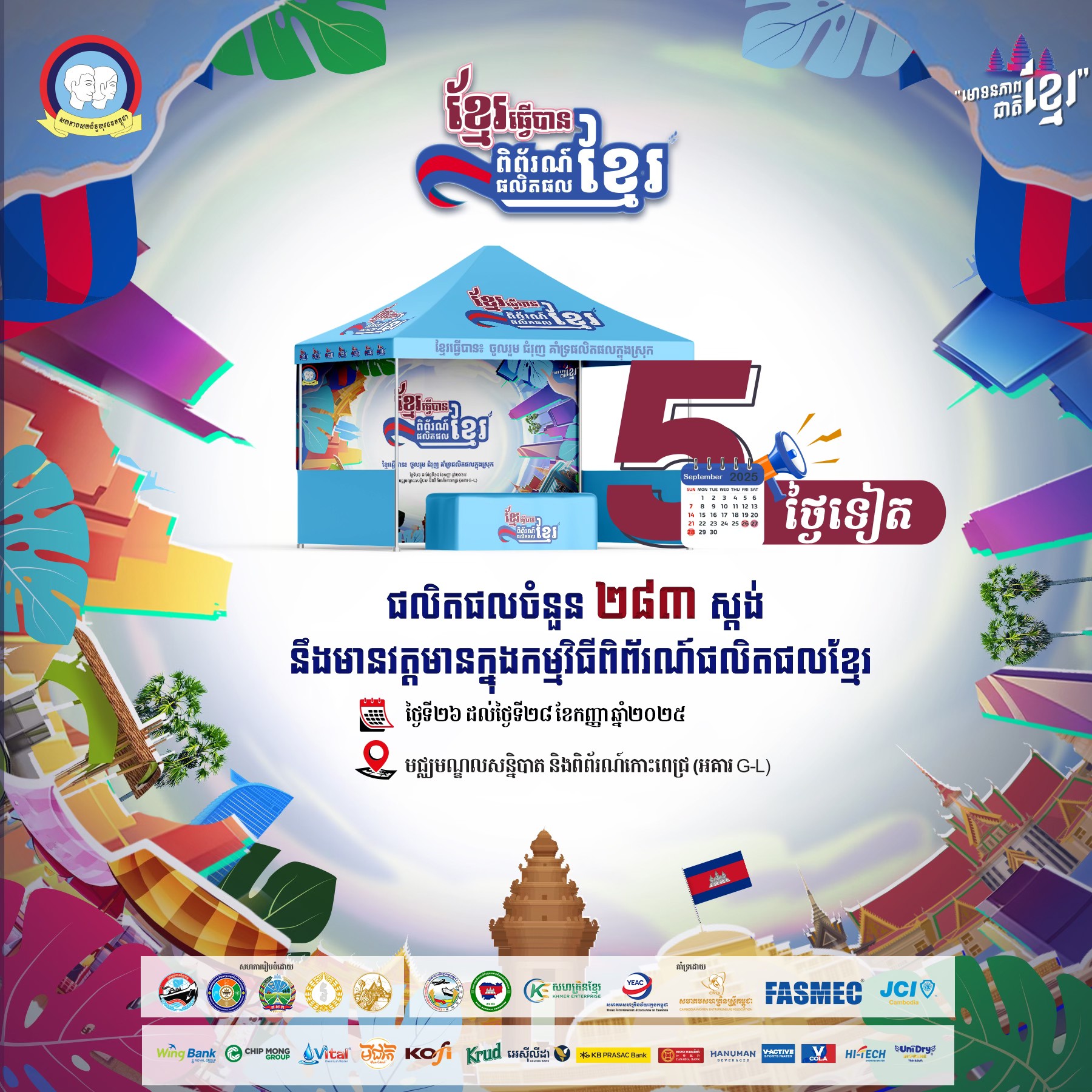 ភ្នំពេញ៖ សហភាពសហព័ន្ធយុវជនកម្ពុជា (ស.ស.យ.ក.) ដោយមានកិច្ចសហការគាំទ្រពីក្រសួង-ស្ថាប័ន សភាពាណិជ្ជកម្មកម្ពុជា និងសមាគមពាក់ព័ន្ធ បានរៀបចំពិព័រណ៍ផលិតផលខ្មែរ ក្រោមប្រធានបទ «ខ្មែរធ្វើបាន៖ ចូលរួមជំរុញ គាំទ្រផលិតផលក្នុងស្រុក» ដែលនឹងប្រព្រឹត្តទៅរយៈពេល ៣ ថ្ងៃផ្តើមពីរសៀលថ្ងៃទី២៦ ដល់ថ្ងៃទី២៨ ខែកញ្ញា ឆ្នាំ២០២៥ នៅមជ្ឈមណ្ឌលសន្និបាត និងពិព័រណ៍កោះពេជ្រ(អគារG-H-I-J-K-L)។