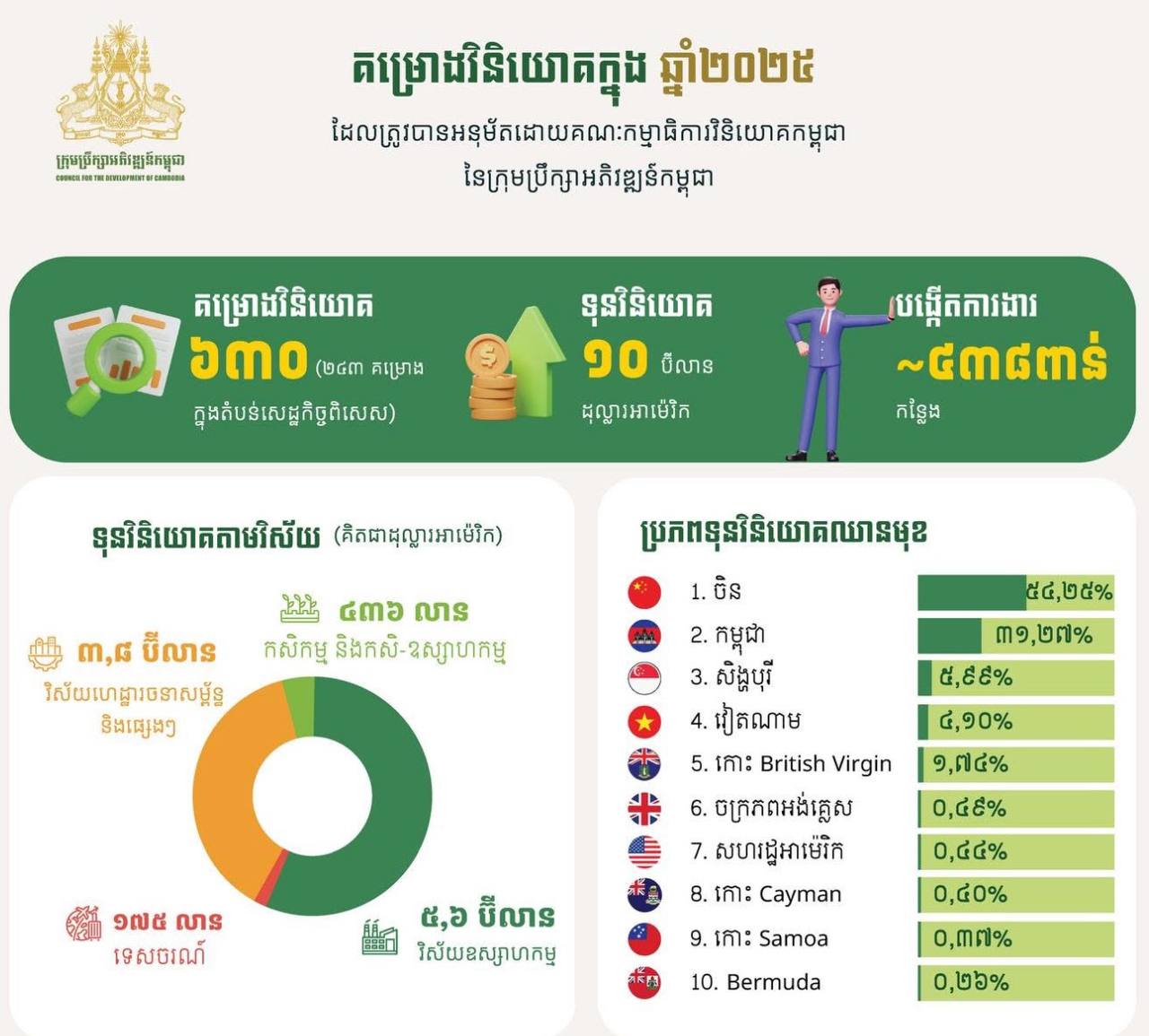 ភ្នំពេញ៖ ក្រុមប្រឹក្សាអភិវឌ្ឍន៍កម្ពុជា (CDC )នៅឆ្នាំ២០២៥ កន្លងទៅនេះ បានចុះបញ្ជីគម្រោងវិនិយោគចំនួន៦៣០ ដែលមានទុនវិនិយោគសរុបប្រមាណ ១០ប៊ីលានដុល្លារអាម៉េរិក និងអាចបង្កើតការងារបានប្រមាណ ៤៣៨ពាន់កន្លែង។