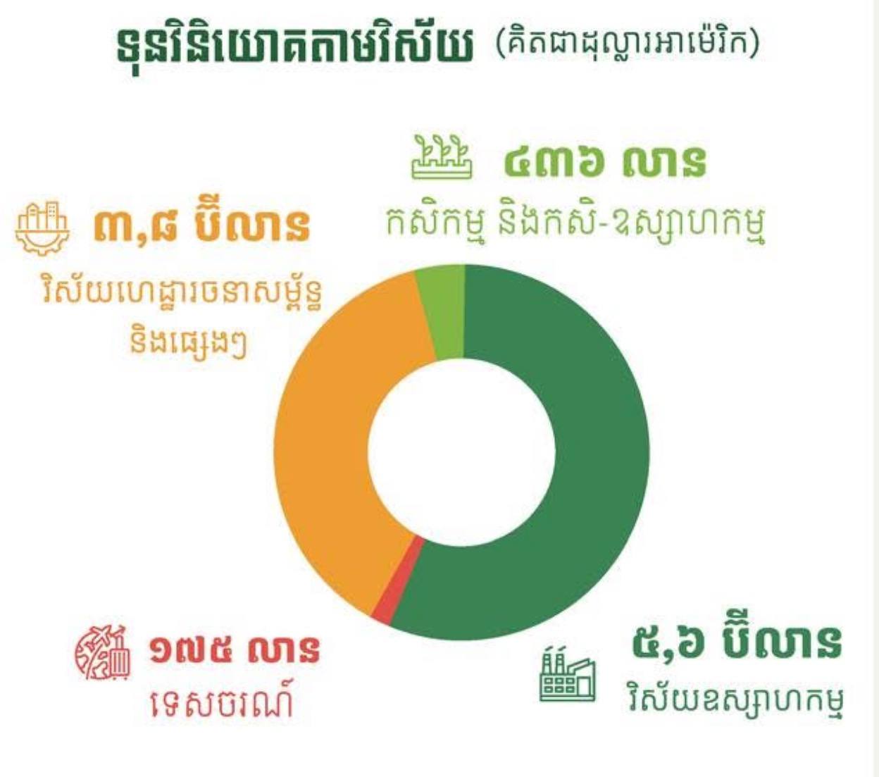 សូមបញ្ជាក់ថា គម្រោងវិនិយោគលើវិស័យឧស្សាហកម្ម មានទំហំធំជាងគេដែលមានទុន ៥,៦ប៊ីលាន បន្ទាប់មកវិស័យហេដ្ឋារចនាសម្ព័ន្ធ និងវិស័យផ្សេងៗចំនួន ៣,៨ ប៊ីលាន វិស័យកសិកម្ម-កសិឧស្សាហកម្ម៤៣៦លានដុល្លារ និងវិស័យទេសចរណ៍១៧៥លានដុល្លារ។ រីឯប្រភពទុនឈានមុខគេ គឺប្រទេសចិនដែលមានជាង៥៤ភាគរយ កម្ពុជាជាង៣១% សិង្ហបុរីជិត៦% វៀតណាមជាង៤% និងកោះBritish Virgin ជិត២ភាគរយ។