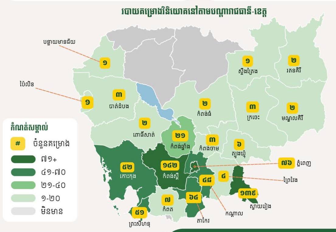 ប្រភព CDC បានឱ្យដឹងផងដែរថា៖ ខេត្តកំពង់ស្ពឺទទួលបានគម្រោងវិនិយោគច្រើនជាងគេគឺ១៤២គម្រោង បន្ទាប់មកខេត្តស្វាយរៀងចំនួន១៣៩គម្រោង រាជធានីភ្នំពេញចំនួន៧៦គម្រោង ខេត្តតាកែវ៦៤ ខេត្តកោះកុង៥២ ខេត្តព្រះសីហនុ៥១ ខេត្តកណ្តាល៤៨ និងខេត្តកំពង់ឆ្នាំងចំនួន ២១ ។ ដោយឡែកក្រុមប្រឹក្សាអភិវឌ្ឍន៍កម្ពុជា បានឱ្យដឹងផងដែរថា៖នៅក្នុងឆ្នាំ២០២៥នេះ អនុគណៈកម្មាធិការវិនិយោគរាជធានី-ខេត្ត បានសម្រេចចុះបញ្ជីគម្រោងវិនិយោគ សរុបចំនួន ២២៨គម្រោង ដែលមានទុនវិនិយោគសរុបប្រមាណ៧៦៣លានដុល្លារអាម៉េរិកនិងអាចបង្កើត ការងារបានប្រមាណ១០៦ពាន់កន្លែង។