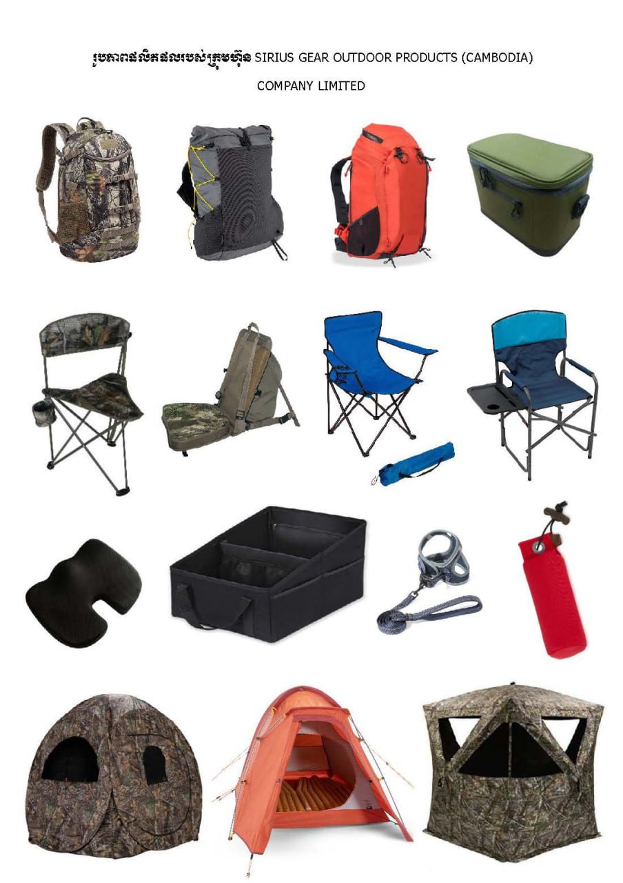 ៧-“SIRIUS GEAR OUTDOOR PRODUCTS (CAMBODIA) COMPANY LIMITED” គម្រោងបង្កើតរោងចក្រផលិតកាបូបសម្ភារៈធ្វើដំណើរ កៅអី (ដែក-ក្រណាត់) តង់ សម្ភារៈក្នុងឡាន និងសម្ភារៈសត្វចិញ្ចឹម ដែលមានទីតាំងវិនិយោគស្ថិតនៅភូមិព្រៃចំការ ឃុំលំហាចស្រុកអង្គស្នួលខេត្តកណ្តាលក្នុងទុនវិនិយោគប្រមាណ៥,១លានដុល្លារអាម៉េរិកនិងអាចបង្កើតការងារបានចំនួន២.២០៨កន្លែង៕