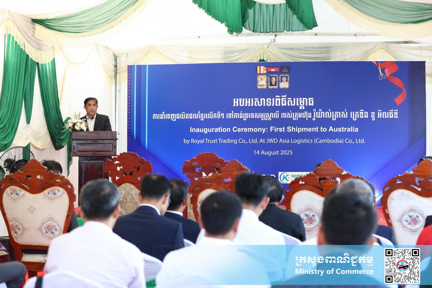 សូមបញ្ជាក់ថា ក្រុមហ៊ុន រ៉ូយ៉ាល់ ត្រាស់ ត្រេឌីង ខូអិលធីឌី (RTT) បាននាំចេញគ្រាប់ធញ្ញជាតិ និងផ្លែឈើក្រៀមទៅកាន់ទីផ្សារប្រទេសអូស្ត្រាលីមានទំហំជាង១២តោន ដែលសុទ្ធសឹងជាផលិតផលកសិកម្មកែច្នៃ រួមមាន ៖ គ្រាប់ស្វាយចន្ទី ស្វាយក្រៀម ខ្នុរក្រៀម ចេកក្រៀម និងត្រាវចំណិតក្រៀម។