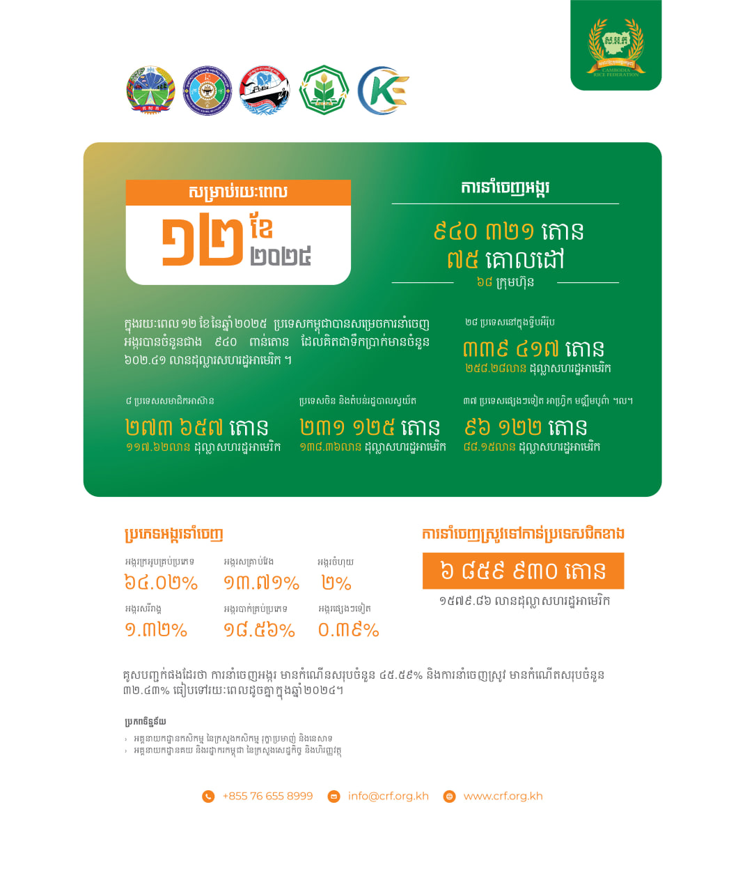 ភ្នំពេញ៖ យោងតាមរបាយការណ៍លម្អិតរបស់សហព័ន្ធស្រូវអង្ករកម្ពុជា (CRF) បានបញ្ជាក់ថា នៅឆ្នាំ២០២៥ កន្លងទៅនេះ កម្ពុជាបានសម្រេចនាំចេញអង្ករទៅកាន់ទីផ្សារអន្តរជាតិសរុបចំនួន ៩៤០ ៣២១ តោន គិតជាទឹកប្រាក់បានចំនួន ៦០២.៤១លានដុល្លារសហរដ្ឋអាម៉េរិក បើធៀបទៅនឹងឆ្នាំ២០២៤ ដែលនាំចេញបានត្រឹមតែ ៦៤ម៉ឺនតោននោះ មានការកើនឡើង ៤៥.៥៩ ភាគរយ។
