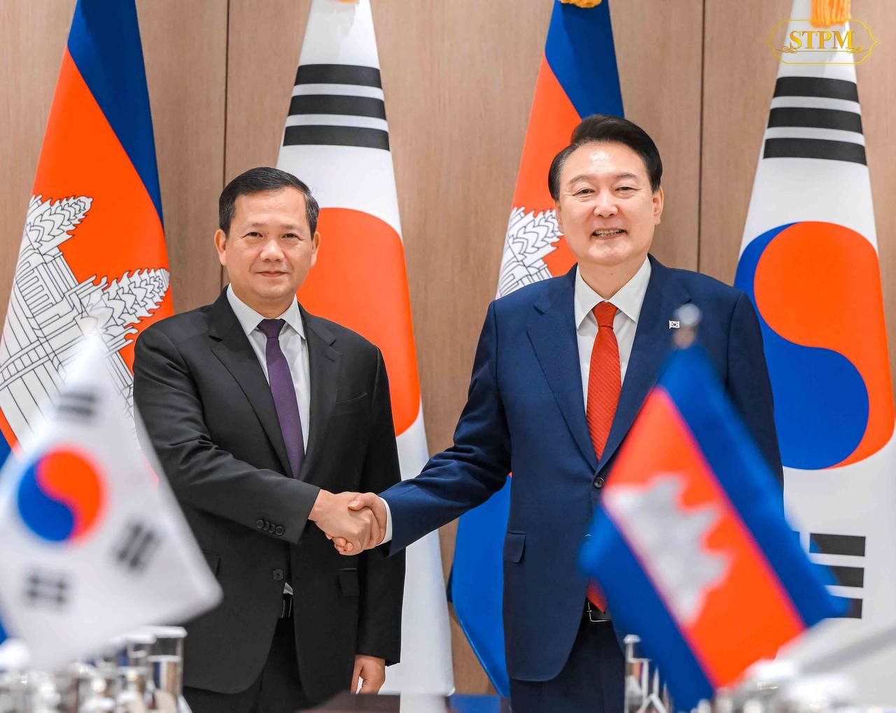 គួរជម្រាបថា ៖ សម្តេចធិបតីនាយករដ្ឋមន្ត្រីបានដឹកនាំគណៈប្រតិភូរាជរដ្ឋាភិបាលកម្ពុជា ទៅបំពេញទស្សនកិច្ចផ្លូវការចាប់ពី ថ្ងៃទី១៥-១៨ ខែឧសភា ឆ្នាំ២០២៤ នៅទីក្រុងសេអ៊ូល សាធារណរដ្ឋកូរ៉េ ។ ក្នុងឱកាសនៃទស្សនកិច្ចនេះ សម្តេចធិបតីបានជួបទ្វេភាគីជាមួយ ឯកឧត្តម ប្រធានាធិបតី យូន ស៊ុក យ៉ល ពិភាក្សាស៊ីជម្រៅលើភាពជាដៃគូ និងពង្រីកកិច្ចសហប្រតិបត្តិការពហុវិស័យ ដើម្បីលើកកម្ពស់ទំនាក់ទំនងនៃប្រទេសទាំងពីរឱ្យមានភាពស្និទ្ធស្នាលបន្ថែមទៀត ។