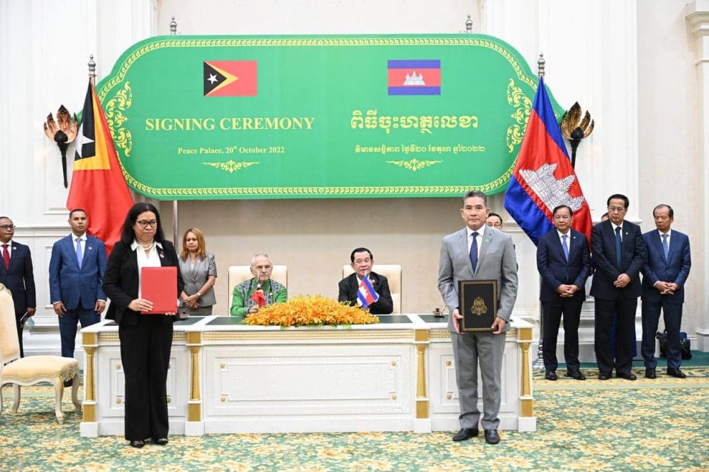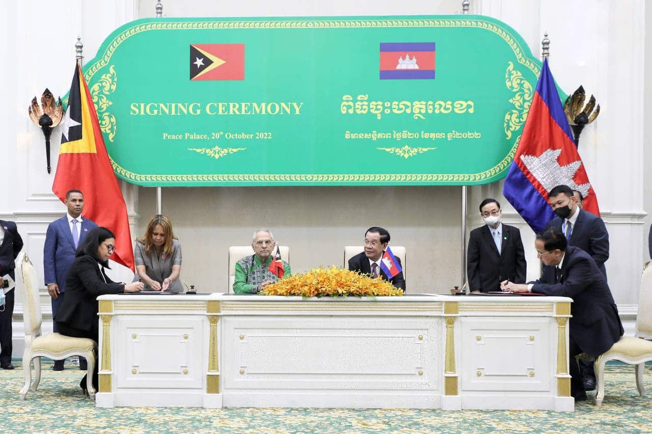 ភ្នំពេញ ៖ ប្រមុខដឹកនាំកំពូលរវាងព្រះរាជាណាចក្រកម្ពុជា និងសាធារណរដ្ឋប្រជាធិបតេយ្យទីម័រឡេស្តេ បានយល់ព្រមរួមគ្នាក្នុងការពង្រឹង និងពង្រីកទំហំពាណិជ្ជកម្មរួមគ្នា ជាពិសេសជំរុញឱ្យមានជើងហោះហើរត្រង់ដើម្បីអាចលើកកម្ពស់វិស័យសេដ្ឋកិច្ច។