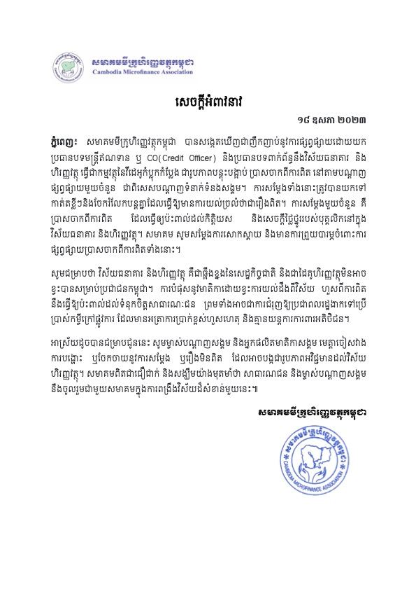 ភ្នំពេញ៖ សមាគមមីក្រូហិរញ្ញវត្ថុកម្ពុជា អំពាវនាវដល់ម្ចាស់បណ្តាញសង្គម និងអ្នកផលិតមាតិកាសង្គមមេត្តាចៀសវាងការបង្ហោះ ឬចែកចាយនូវការសម្តែង ឬរឿងមិនពិត ទាក់ទងនឹងប្រធានបទមន្រ្តីឥណទាន ឬ CO (Credit Officer) និងពាក់ព័ន្ធនឹងវិស័យធនាគារ និងហិរញ្ញវត្ថុ ព្រោះវាអាចបង្កជារូបភាពអវិជ្ជមានដល់វិស័យ ហិរញ្ញវត្ថុ។