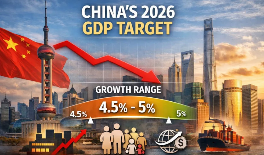 នៅក្នុងកិច្ចប្រជុំបើកសភាប្រជាជនចិន (NPC) កាលពីថ្ងៃព្រហស្បតិ៍ សប្ដាហ៍នេះ លោកនាយករដ្ឋមន្ត្រី Li Qiang បានបង្ហាញរបាយការណ៍ការងាររបស់រដ្ឋាភិបាលថា គោលដៅកំណើនសេដ្ឋកិច្ចត្រូវបានកំណត់ចន្លោះពី ៤,៥% ទៅ ៥% ជាលើកដំបូងសម្រាប់ឆ្នាំ២០២៦ បន្ទាប់ពីគោលដៅត្រូវបានកំណត់យ៉ាងហោចណាស់ ៥% ក្នុងរយៈពេល៣ឆ្នាំកន្លងមកនេះ។ ការកំណត់កំណើនសេដ្ឋកិច្ចពី ៤,៥% ទៅ ៥% គឺជាគោលដៅកំណើនទាបបំផុតចាប់តាំងពីឆ្នាំ១៩៩១។