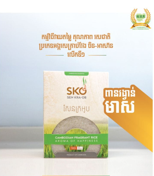 សូមជម្រាបថា អង្ករម៉ាកសមូហភាព SKO ដែលមានពូជស្រូវឈ្មោះសែនក្រអូប (SEN KRA-OB) ត្រូវបានទទួលស្គាល់ដោយ គណៈកម្មាធិការប្រកួត ជាពូជស្រូវល្អ និងមានរសជាតិឆ្ងាញ់ ព្រមទាំងឈ្នះពានរង្វាន់មាស ក្នុងចំណោមពានរង្វាន់មាសរបស់ពូជស្រូវរបស់ប្រទេសផ្សេងទៀត។ សហព័ន្ធស្រូវអង្ករកម្ពុជា សូមថ្លែងអំណរគុណដល់ប្រជាកសិករទាំងអស់ដែលបានខិតខំយកចិត្តទុកដាក់ ដាំដុះ ថែទាំ និងផ្តល់នូវគ្រាប់ស្រូវដែលផលិតចេញជាអង្ករដែលមានគុណភាព ឱជារស មិនតែប៉ុណ្ណោះសម្រស់គ្រាប់អង្ករបានយ៉ាងល្អ ដែលនាំឱ្យទទួលបាននូវពានរង្វាន់មាសនៅពេលនេះផងដែរ។