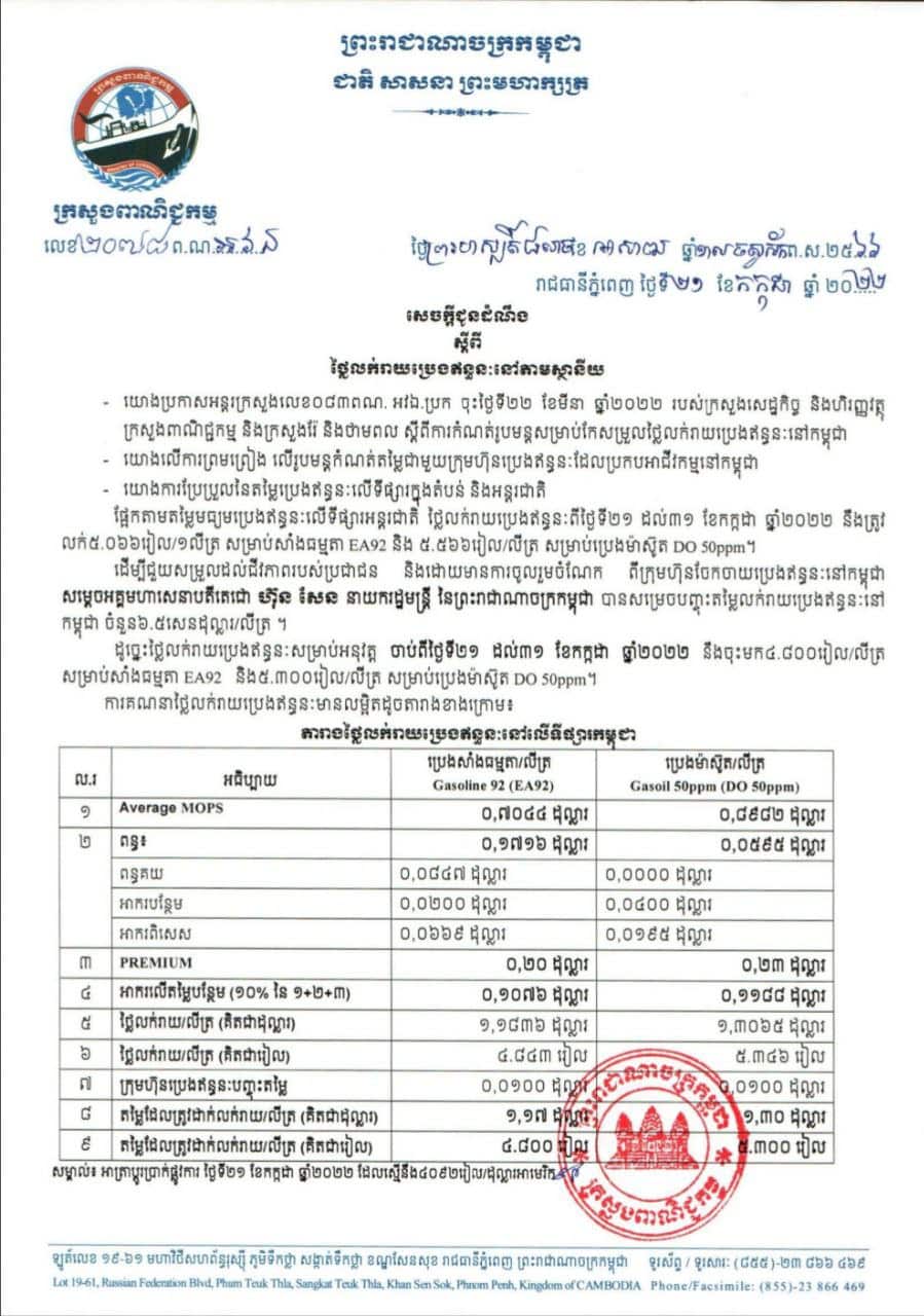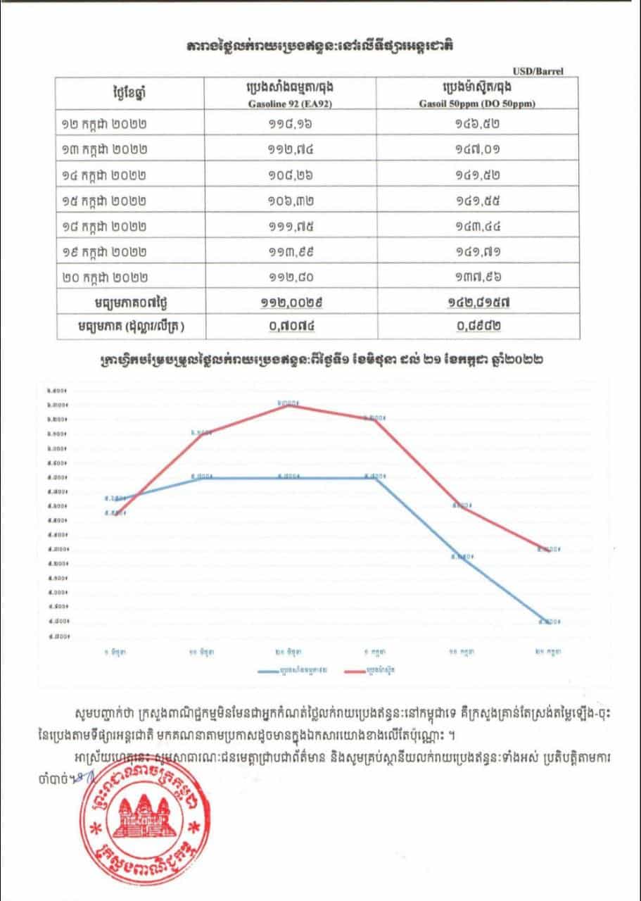 ផ្នែកតាមតម្លៃមធ្យមប្រេងឥន្ធនៈលើទីផ្សារអន្តរជាតិ ថ្លៃលក់រាយប្រេងឥន្ធនៈពីថ្ងៃទី ២១ ដល់ខែ៣១ ខែកក្កដា ឆ្នាំ ២០២២ នឹងត្រូវលក់ ៥.០៦៦រៀល ក្នុងមួយលីត្រ សម្រាប់សាំងធម្មតា និង ៥.៥៦៦រៀល ក្នុងមួយលីត្រ សម្រាប់ប្រេងម៉ាស៊ូត។