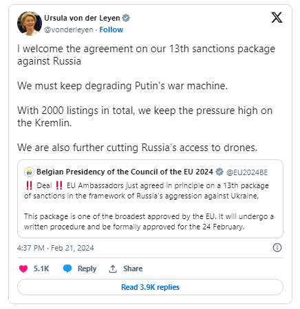 «ខ្ញុំស្វាគមន៍ចំពោះកិច្ចព្រមព្រៀងស្តីពីកញ្ចប់ទណ្ឌកម្មលើកទី ១៣របស់យើងប្រឆាំងនឹងរុស្ស៊ី។ យើងត្រូវតែរារាំងសង្រ្គាមរបស់លោក Putin។ ជាមួយនឹងការចុះបញ្ជីសរុបចំនួន ២ ០០០ យើងនៅតែបន្តបន្ថែមសម្ពាធលើវិមានក្រឹមឡាំង។ យើងក៏កំពុងកាត់បន្ថយការប្រើប្រាស់យន្តហោះគ្មានមនុស្សបើករបស់រុស្ស៊ីបន្ថែមទៀតផងដែរ»។