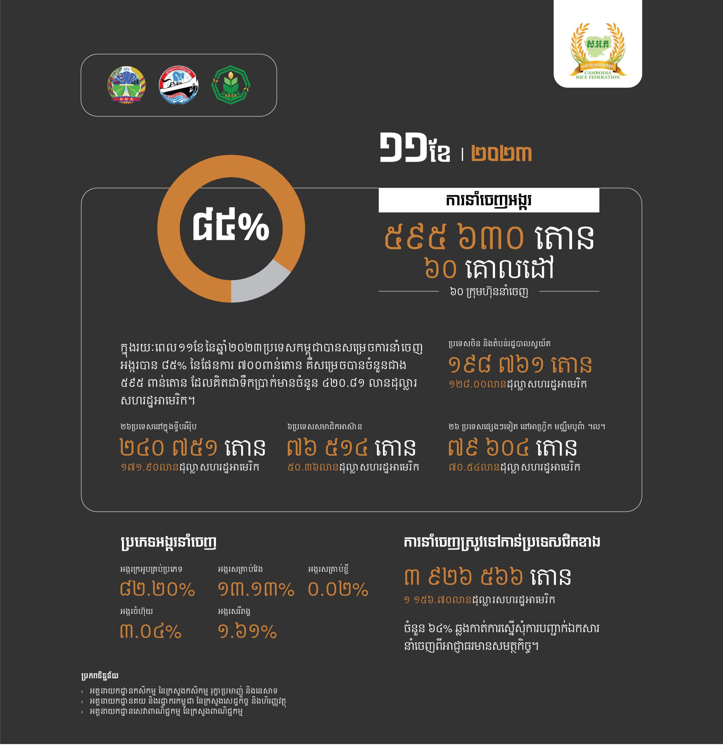 ទិន្នន័យរបស់សហព័ន្ធស្រូវអង្ករ បានបញ្ជាក់ថា ក្នុងរយៈពេល ១១ខែ ចាប់ពីខែមករាដល់ខែវិច្ឆិកា កម្ពុជាបាននាំចេញអង្ករបានចំនួនប្រមាណ ៥៩៥ ៦៣០ តោន ដោយក្រុមហ៊ុននាំចេញអង្ករចំនួន ៦០ ក្រុមហ៊ុនទៅកាន់គោលដៅចំនួន ៦០ ដែលក្នុងនោះប្រទេសចិន និងហុងកុងបានចំនួន ១៩៨ ៧៦១ តោន ដែលគិតជាទឹកប្រាក់បានចំនួន ១២៨ លានដុល្លារ ទៅកាន់ប្រទេសនៅទ្វីបអឺរ៉ុបចំនួន ២៦ប្រទេស បានចំនួន ២៤០ ៧៥១ តោន ដែលគិតជាទឹកប្រាក់បានចំនួន ១៧១.៩០ លានដុល្លារ ។