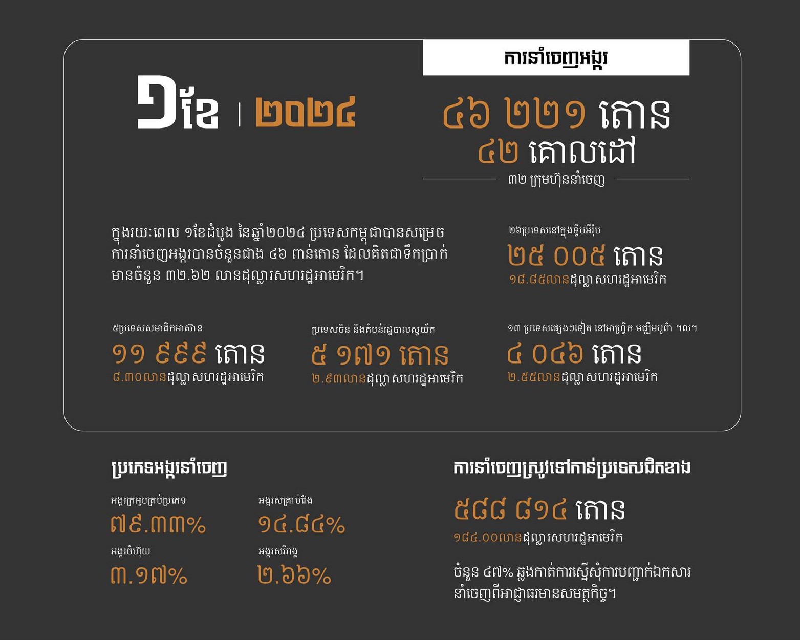 ភ្នំពេញ៖ កម្ពុជា សម្រាប់ខែមករា ឆ្នាំ២០២៤ បាននាំចេញអង្ករចំនួន ៤៦ ២២១ តោន គិតជាទឹកប្រាក់ចំនួន ៣២.៦២លានដុល្លារ សហរដ្ឋអាមេរិក។ នេះបើតាមសេចក្ដីប្រកាសព័ត៌មានរបស់សហព័ន្ធស្រូវអង្ករកម្ពុជា។
