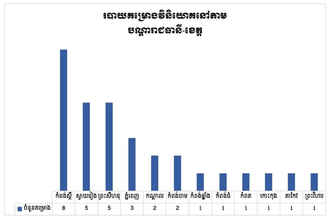 ក្នុងចំណោមគម្រោងវិនិយោគសរុបទាំងនោះ គម្រោងវិនិយោគដែលមានទីតាំងស្ថិតនៅក្រៅតំបន់សេដ្ឋកិច្ចពិសេសមានចំនួន២១គម្រោង និងគម្រោងវិនិយោគដែលមានទីតាំងស្ថិតនៅក្នុងតំបន់សេដ្ឋកិច្ចពិសេសមានចំនួន១០គម្រោង។ នៅក្នុងគម្រោងវិនិយោគទាំងអស់នេះ គម្រោងដែលមានប្រភពមកពីប្រទេសចិនស្ថិតនៅលំដាប់លេខរៀងទី១ ដោយបានរួមចំណែក ៥៣,៣៩% នៃទុនវិនិយោគសរុប ខណៈពេលដែលការវិនិយោគក្នុងស្រុកគ្របដណ្តប់២៩,៤៧% នៃទុនវិនិយោគសរុប។