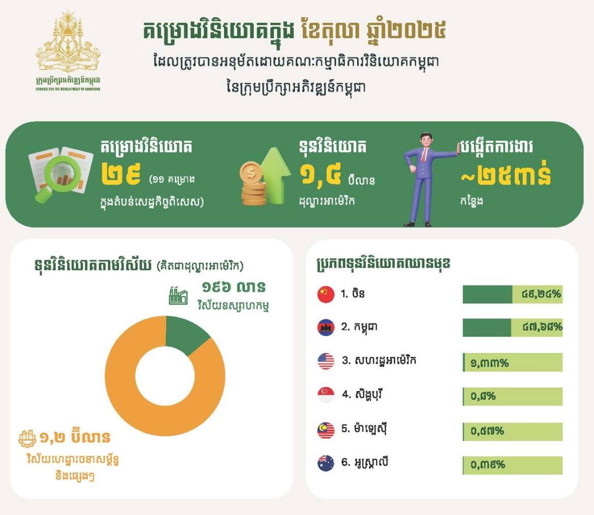 ភ្នំពេញ៖ គម្រោងវិនិយោគចំនួន២៩ ក្នុងទំហំទុនសរុបប្រមាណ ១,៤ ប៊ីលានដុល្លារអាម៉េរិក និងអាចបង្កើតការងារបានប្រមាណ ២៥ពាន់កន្លែង ត្រូវបានចុះបញ្ជីដោយគណៈកម្មាធិការវិនិយោគកម្ពុជា (គ.វ.ក) នៃក្រុមប្រឹក្សាអភិវឌ្ឍន៍កម្ពុជា(CDC) នៅក្នុងអំឡុងខែតុលា ឆ្នាំ២០២៥។ នេះបើយោងតាមសេចក្តីប្រកាសព័ត៌មានរបស់ CDC នាថ្ងៃទី៧ ខែវិច្ឆិកា ឆ្នាំ២០២៥។