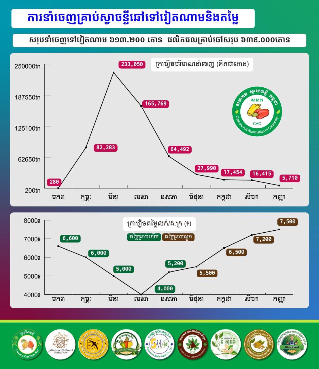 សូមបញ្ជាក់ថា នៅខែកញ្ញា គ្រាប់ស្វាយចន្ទីស្ងួតមានតម្លៃ ៧ ០០០ ទៅ ៧ ៥០០រៀល ក្នុងមួយគីឡូក្រាម ឬស្មើ ១ ៩០០ដុល្លារក្នុងមួយតោន។ ចំពោះតម្លៃនេះបានហាក់ឡើងខ្ពស់បន្តិច ធៀបនឹងតម្លៃមធ្យម ១ ៦៥៨ដុល្លារ ក្នុងមួយតោន។