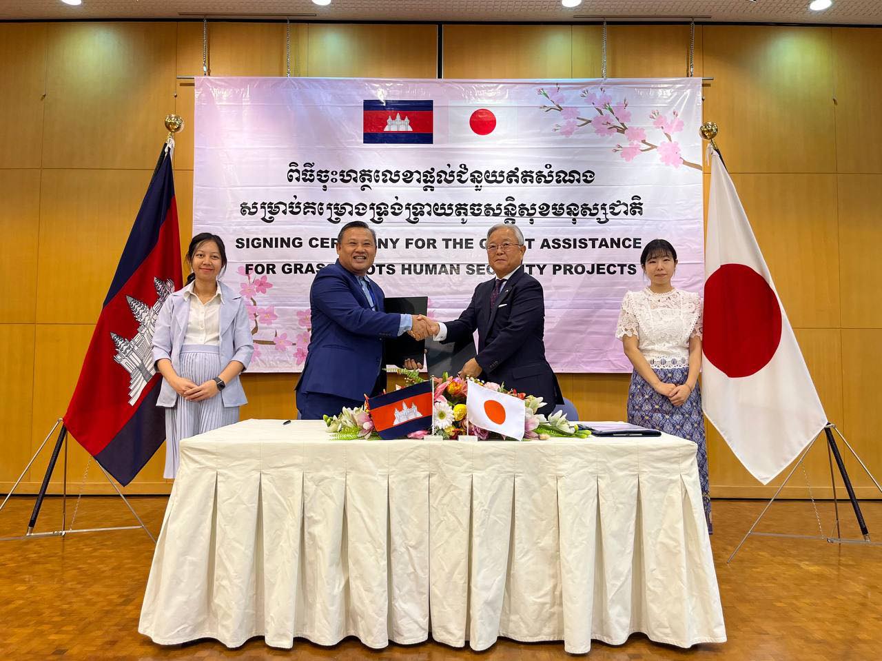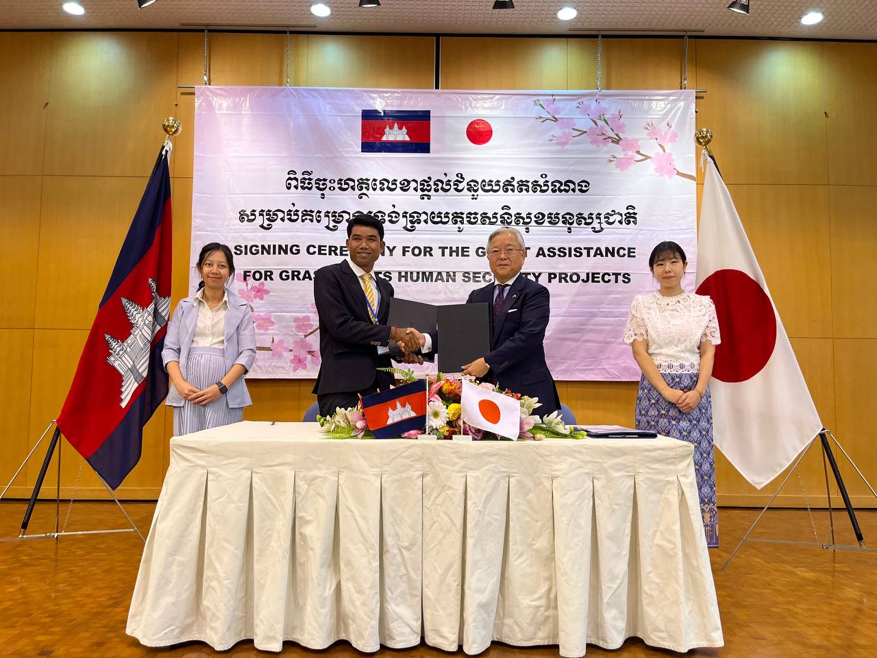 ឯកអគ្គរាជទូតជប៉ុន លោក អ៊ូអិណុ និងអ្នកតំណាងមកពីស្ថាប័នទទួលជំនួយទាំង៣ បានចុះហត្ថលេខាលើកិច្ចសន្យាផ្តល់ជំនួយឥតសំណងនេះ កាលពីថ្ងៃទី៣០ ខែមករា នៅស្ថានទូតជប៉ុនប្រចាំកម្ពុជា។