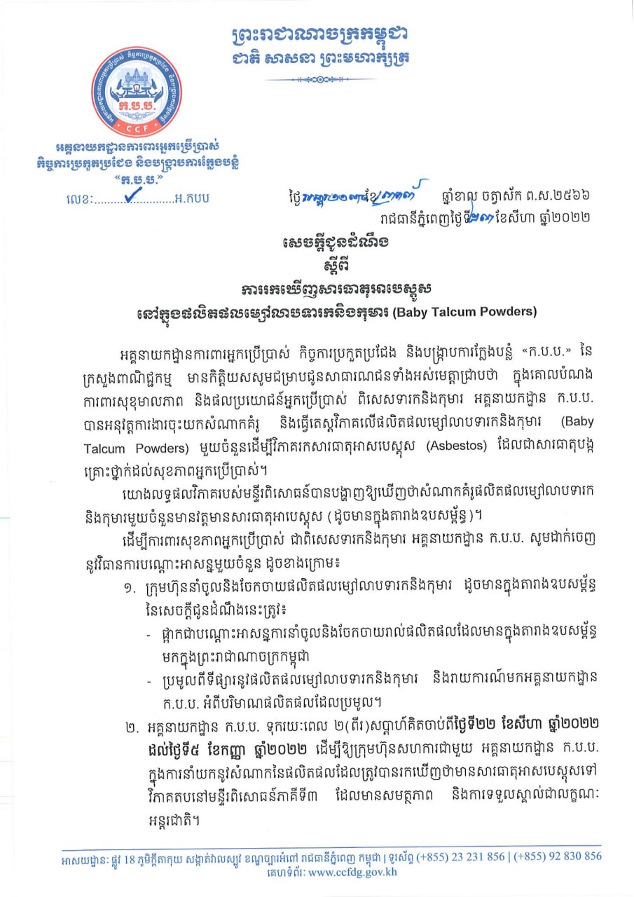 ភ្នំពេញ ៖ បន្ទាប់ពីមានការផ្ទុះឡើងនូវព័ត៌មានបញ្ជាក់ពីភាពប្រតិកម្មរឿងម្សៅលាបខ្លួនទារក និងកុមារចំនួន១២ប្រភេទ ត្រូវបានរកឃើញមានផ្ទុកសារធាតុគីមីប្រភេទ អាសបេស្តុស(Asbestos) ដែលអាចបង្កគ្រោះថ្នាក់យ៉ាងខ្លាំងចំពោះសុខភាពមនុស្ស អគ្គនាយកដ្ឋានការពារអ្នកប្រើប្រាស់ កិច្ចការប្រកួតប្រជែង និងបង្ក្រាបការក្លែងបន្លំ (ក.ប.ប) នៃក្រសួងពាណិជ្ជកម្ម បានសម្រេចទុកពេលឱ្យក្រុមហ៊ុន ចំនួន១៤ថ្ងៃ ដោយគិតចាប់ពីថ្ងៃទី២២ ខែសីហា រហូតដល់ថ្ងៃទី៥ ខែកញ្ញា ឆ្នាំ២០២២ ដើម្បីនាំយកសំណាកនៃផលិតផលដែលត្រូវបានរកឃើញមានសារធាតុអាសបេស្តុសនោះ ទៅវិភាគបន្តនៅមន្ទីរពិសោធន៍ភាគីទី៣ ដែលមានសមត្ថភាព និងការទទួលស្គាល់ជាលក្ខណៈអន្តរជាតិ។