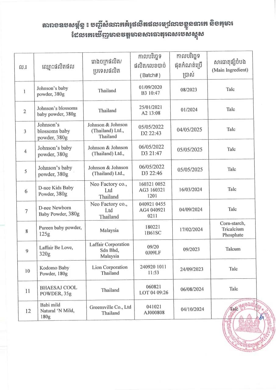 យោងតាមសេចក្ដីជូនដំណឹងរបស់អគ្គនាយកដ្ឋានការពារអ្នកប្រើប្រាស់កិច្ចការប្រកួតប្រជែង និងបង្ក្រាបការក្លែងបន្លំ (ក.ប.ប) កាលពីថ្ងៃទី២៣ ខែសីហា ឆ្នាំ២០២២ ថ្មីៗនេះ ដោយតម្រូវឱ្យក្រុមហ៊ុននាំចូល និងចែកចាយម្សៅលាបទារក និងកុមារក្នុងតារាងឧបសម្ព័ន្ធ ត្រូវផ្អាកបណ្ដោះអាសន្ននូវការនាំចូល និងចែកចាយផលិតផលដូចជា Johson’s baby powder380g, Johson’s blossoms baby powder 380g, D-nee Kids baby powder 380g, D-nee Newborn baby powder 380g, Pureen baby powder 125g, Laffair Be Love 320g, Kodomo baby powder 180g, BHAESAJ Cool powder 35g, និងBaby mild Natural’N Mild 180g ផងដែរ។