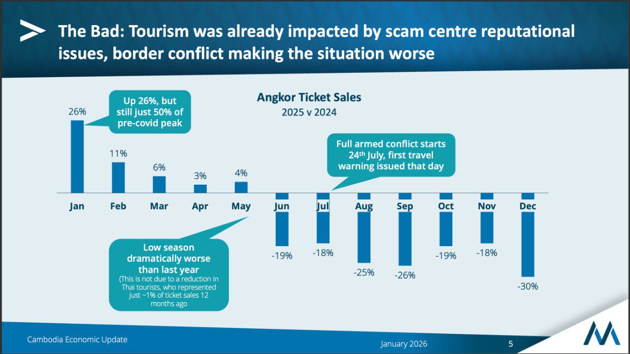 ភ្នំពេញ៖ ការឆបោកតាមប្រព័ន្ធអនឡាញ និងជម្លោះព្រំដែនកម្ពុជា-ថៃ បានធ្វើឱ្យវិស័យទេសចរណ៍កម្ពុជាថមថយ។ នេះជាការលើកឡើងរបស់លោក Stephen Higgings ស្ថាបនិក ស្ថាប័ន Mekong Strategic Capital បាននិយាយនៅក្នុងវេទិកា Industry Views and Outlook for 2026 នៅសណ្ឋគារ រូសវូត រាជធានីភ្នំពេញកាលពីថ្ងៃទី១៤ ខែមករា ឆ្នាំ២០២៥។