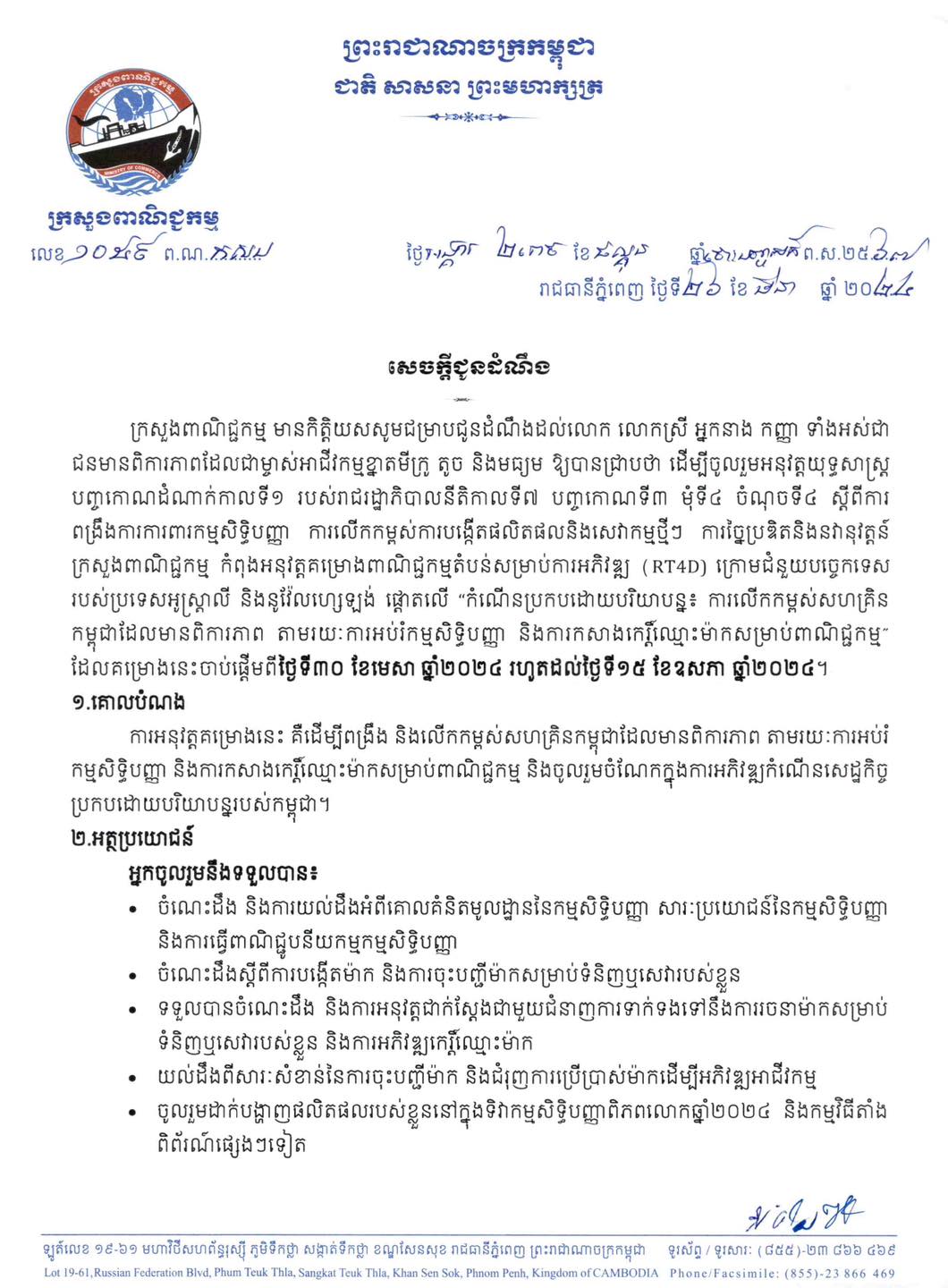 ក្រសួងពាណិជ្ជកម្មបានឱ្យដឹងថា ៖ គម្រោងនេះនឹងចាប់ផ្តើមពីថ្ងៃទី៣០ ខែមេសា ឆ្នាំ២០២៤ រហូតដល់ថ្ងៃទី១៥ ខែឧសភា ឆ្នាំ២០២៤ ក្នុងគោលបំណងពង្រឹង និងលើកកម្ពស់សហគ្រិនកម្ពុជាដែលមានពិការភាពតាមរយៈការអប់រំ កម្មសិទ្ធិបញ្ញា និងការកសាងកេរ្តិ៍ឈ្មោះម៉ាកសម្រាប់ពាណិជ្ជកម្ម និងចូលរួមចំណែកក្នុងការអភិវឌ្ឍកំណើនសេដ្ឋកិច្ច ប្រកបដោយបរិយាបន្នរបស់កម្ពុជា។