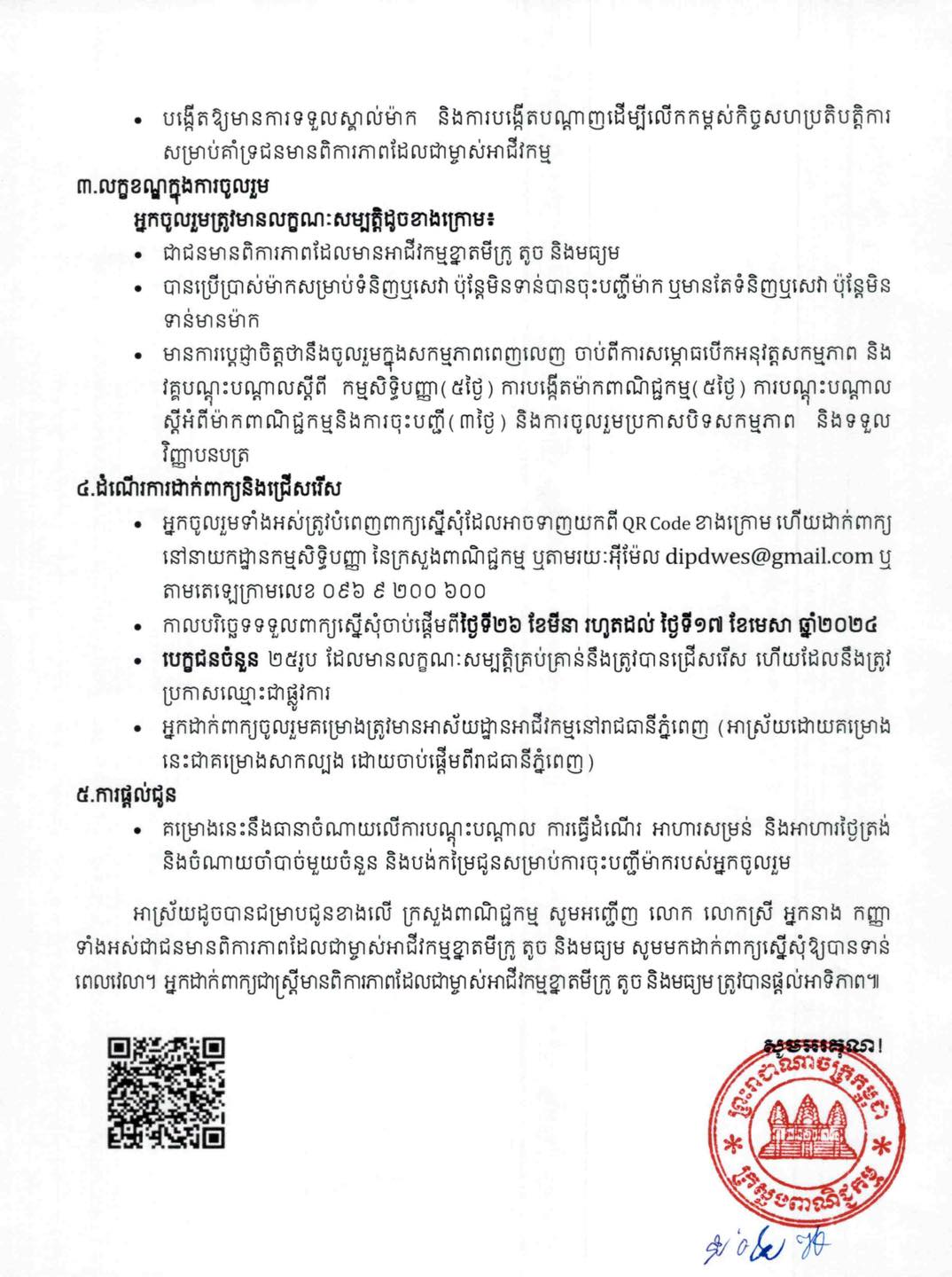 សូមបញ្ជាក់ថា៖ គម្រោងនេះនឹងធានាចំណាយលើការបណ្តុះបណ្តាល ការធ្វើដំណើរ អាហារសម្រន់ និងអាហារថ្ងៃត្រង់ និងចំណាយចាំបាច់មួយចំនួន និងបង់កម្រៃជូនសម្រាប់ការចុះបញ្ជីម៉ាករបស់អ្នកចូលរួម។ អ្នកដាក់ពាក្យជាស្ត្រីមានពិការភាពដែលជាម្ចាស់អាជីវកម្មខ្នាតមីក្រូ តូច និងមធ្យម ត្រូវបានផ្តល់អាទិភាព៕