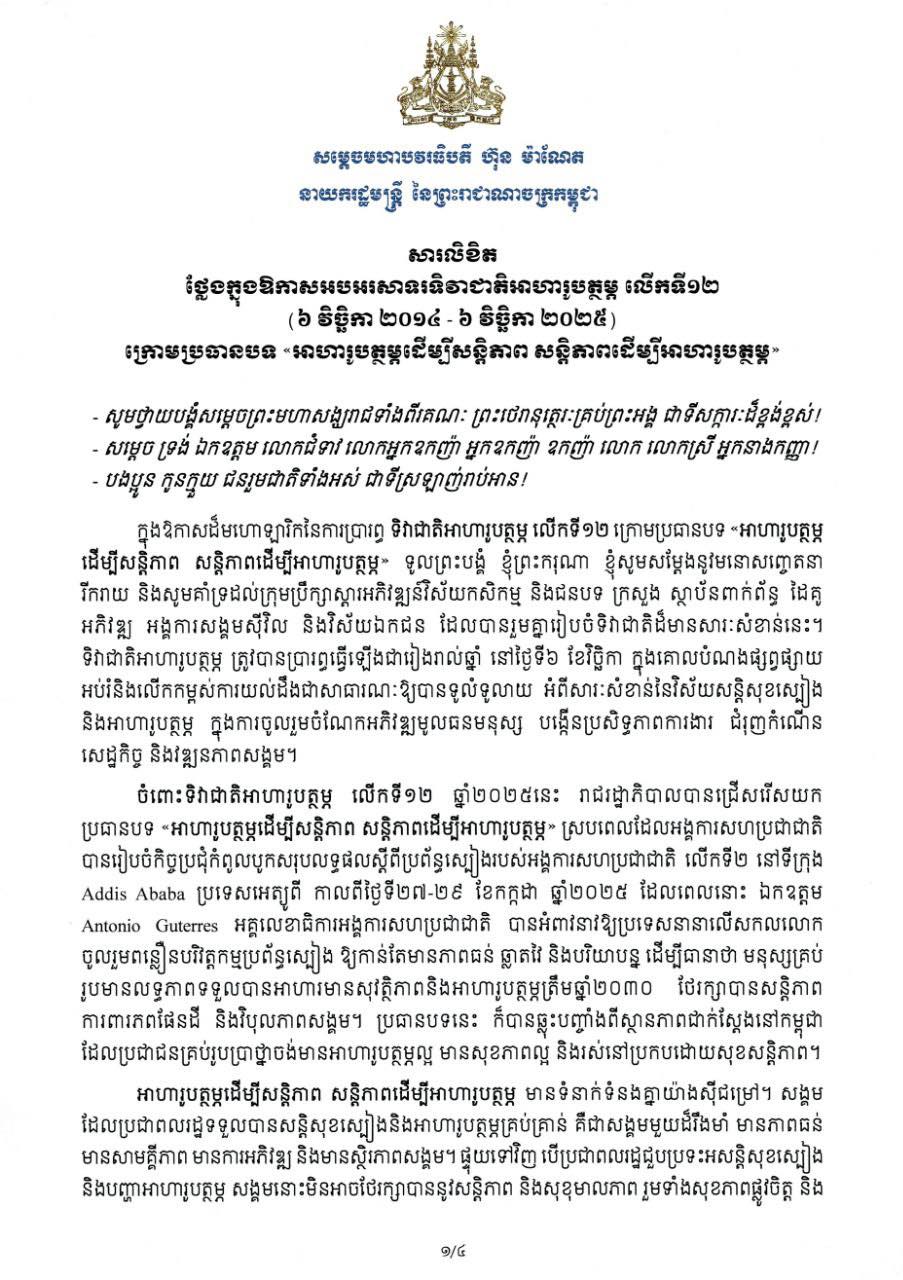 ភ្នំពេញ៖ សម្តេចមហាបវរធិបតី ហ៊ុន ម៉ាណែត នាយករដ្ឋមន្ត្រីនៃព្រះរាជាណាចក្រកម្ពុជា បានណែនាំដល់អ្នកលក់ម្ហូបអាហារគ្រប់ប្រភេទទាំងអស់ ចូលរួមប្រើប្រាស់ផលិតផលក្នុងស្រុក និងយកចិត្តទុកដាក់ខ្ពស់លើសុវត្ថិភាពម្ហូបអាហារ ។ ការណែនាំនេះត្រូវបានបញ្ជាក់តាមរយៈសារលិខិតអបអរសាទរក្នុងឱកាសទិវាជាតិអាហារូបត្ថម្ភ លើកទី១២ (៦ វិច្ឆិកា ២០១៤ – ៦ វិច្ឆិកា ២០២៥) ក្រោមប្រធានបទ «អាហារូបត្ថម្ភដើម្បីសន្តិភាព សន្តិភាពដើម្បីអាហារូបត្ថម្ភ» ដែលបានចេញផ្សាយនៅថ្ងៃទី ៣ ខែវិច្ជិកា ឆ្នាំ២០២៥ ។