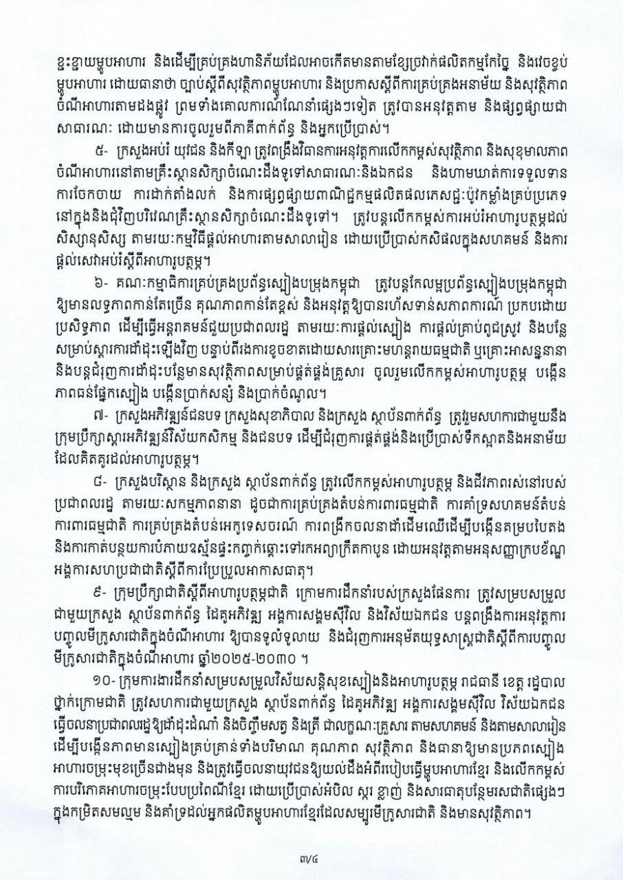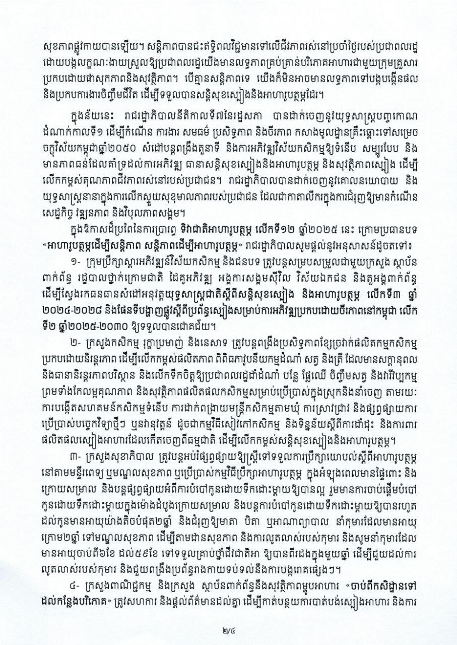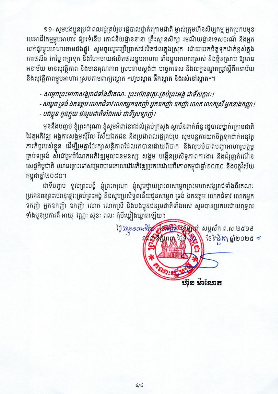 តាមសារលិខិតនេះ សម្តេចមហាបវរធិបតី ហ៊ុន ម៉ាណែត នាយករដ្ឋមន្ត្រី នៃព្រះរាជាណាចក្រកម្ពុជា បានលើកឡើងថា នៅក្នុងឱកាសនេះសូមលើកទឹកចិត្តដល់បងប្អូនប្រជាពលរដ្ឋគ្រប់រូប រដ្ឋបាលថ្នាក់ក្រោមជាតិ ម្ចាស់ក្រុមហ៊ុនសិប្បកម្ម អ្នកប្រកបមុខរបរអាជីវកម្មម្ហូបអាហារ ផ្សារទំនើប ភោជនីយដ្ឋាននានា គ្រឹះស្ថានសិក្សា រមណីយដ្ឋានទេសចរណ៍ និងអ្នកលក់ដូរម្ហូបអាហារតាមដងផ្លូវ សូមចូលរួមប្រើប្រាស់ផលិតផលក្នុងស្រុក ដោយយកចិត្តទុកដាក់ខ្ពស់ក្នុងការផលិត កែច្នៃ រក្សាទុក និងចែកចាយផលិតផលម្ហូបអាហារ ទាំងម្ហូបអាហារស្រស់ និងឆ្អិនស្រាប់ឱ្យមានអនាម័យ មានសុវត្ថិភាព និងមានគុណភាព ស្របតាមស្តង់ដា បច្ចេកទេស និងលក្ខខណ្ឌតម្រូវស្តីពីអនាម័យ និងសុវត្ថិភាពម្ហូបអាហារ ស្របតាមពាក្យស្លោក «ហូបស្អាត ផឹកស្អាត និងរស់នៅស្អាត»។