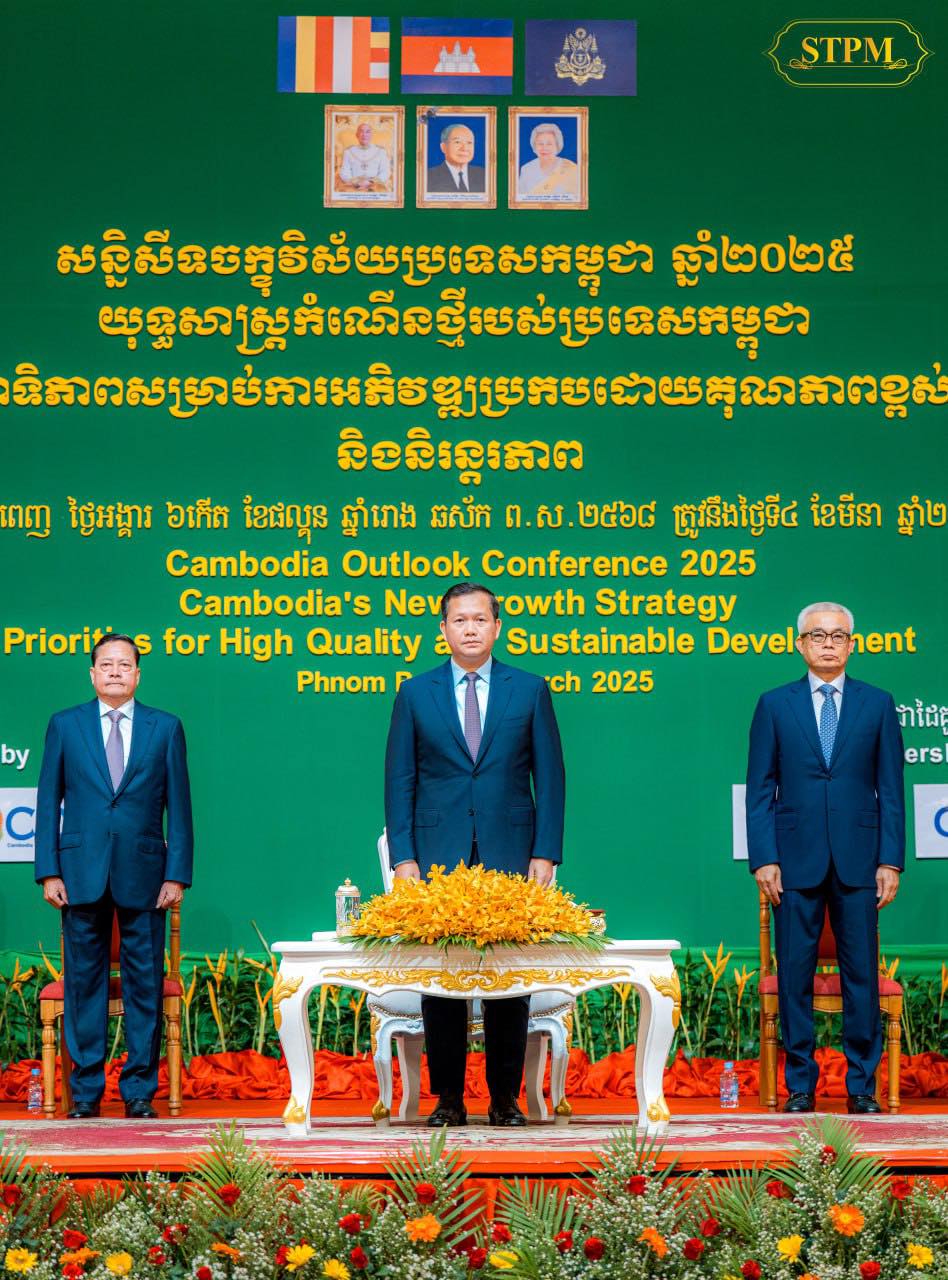 ភ្នំពេញ៖ សម្តេចមហាបវរធិបតី ហ៊ុន ម៉ាណែត នាយករដ្ឋមន្ត្រី នៃព្រះរាជាណាចក្រកម្ពុជា បានអញ្ជើញជាអធិបតីនៅក្នុងសន្និសីទប្រចាំឆ្នាំចក្ខុវិស័យប្រទេសកម្ពុជាឆ្នាំ២០២៥ ក្រោមប្រធានបទ “យុទ្ធសាស្ត្រកំណើនថ្មីរបស់ប្រទេសកម្ពុជា៖ អាទិភាពសម្រាប់ការអភិវឌ្ឍប្រកបដោយគុណភាពខ្ពស់ និងនិរន្តរភាព” នាព្រឹកថ្ងៃទី ៤ ខែមីនា ឆ្នាំ២០២៥ និងបានផ្តល់ជាអនុសាសន៍ជូនវិទ្យាស្ថានបណ្ដុះបណ្ដាល និងស្រាវជ្រាវដើម្បីអភិវឌ្ឍន៍កម្ពុជា (CDRI) ដើម្បីបន្តពង្រឹងសមត្ថភាពស្ថាប័ន ជាពិសេសលើកិច្ចការស្រាវជ្រាវរបស់ខ្លួនឱ្យកាន់តែមានគុណភាពខ្ពស់ប្រកបដោយគុណវុឌ្ឍិ សម្រាប់រាជរដ្ឋាភិបាល ក៏ដូចជាសាធារណជនទូទៅ ។