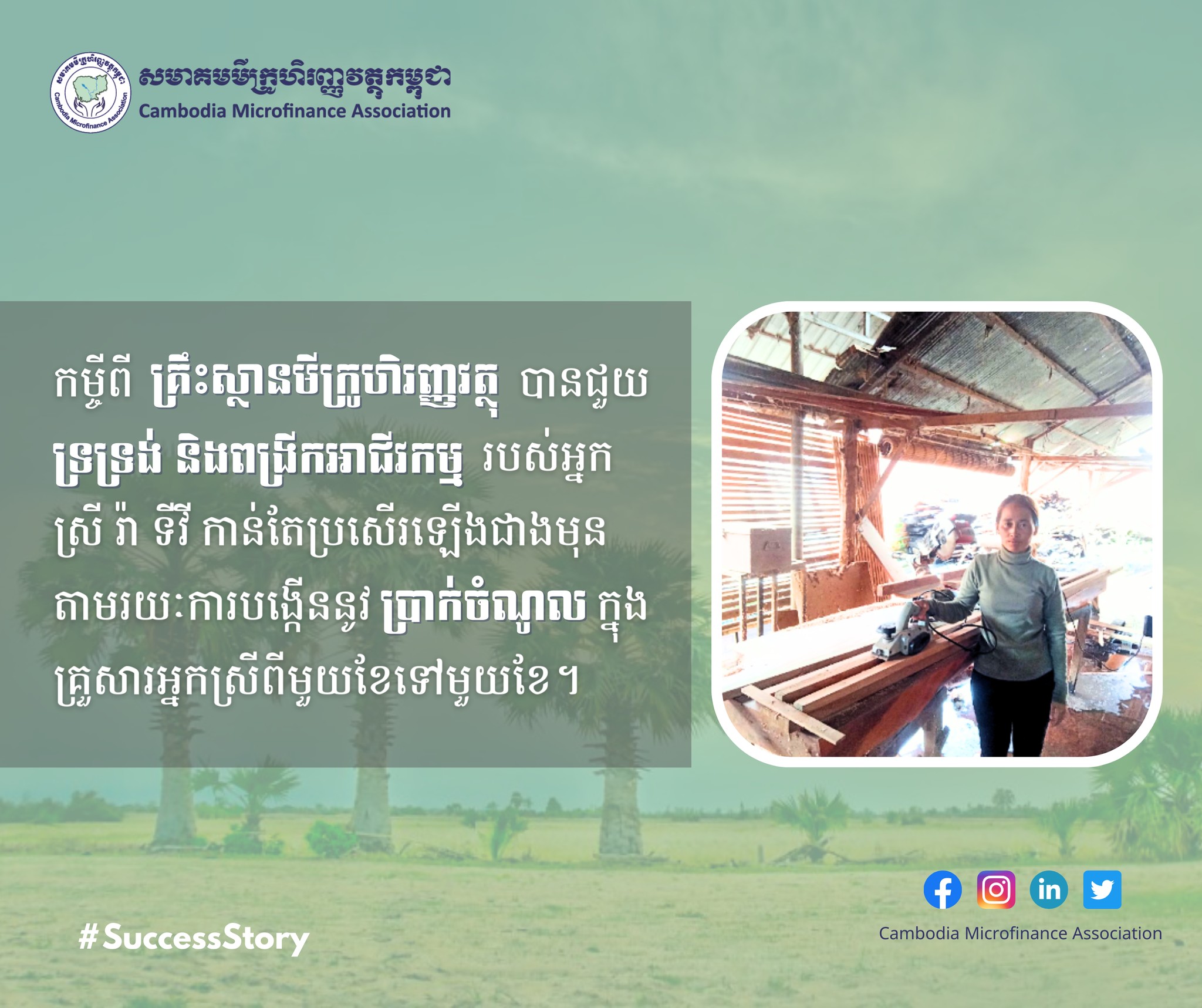 ជាក់ស្តែង អ្នកស្រី រ៉ា ទីវី មានអាយុ ៣២ឆ្នាំ និងស្វាមីមានឈ្មោះ អ៊ូ គីមហៀង ប្រកបរបរជាអ្នកលក់គ្រឿងសង្ហារឹមមានទីលំនៅ នៅ ភូមិប្រីយ៍ថ្មី ឃុំទឹកវិល ក្រុងសៀមរាប ខេត្តសៀមរាប ដែលមានសមាជិកគ្រួសារ ០៥ នាក់ បានសម្រេចចិត្តប្រើប្រាស់កម្ចីជាមួយគ្រឹះស្ថានមីក្រូហិរញ្ញវត្ថុមួយកន្លែង ដែលជួយពង្រីកអាជីវកម្ម និងបង្កើនចំណូលដល់គ្រួសាររបស់អ្នកស្រី។