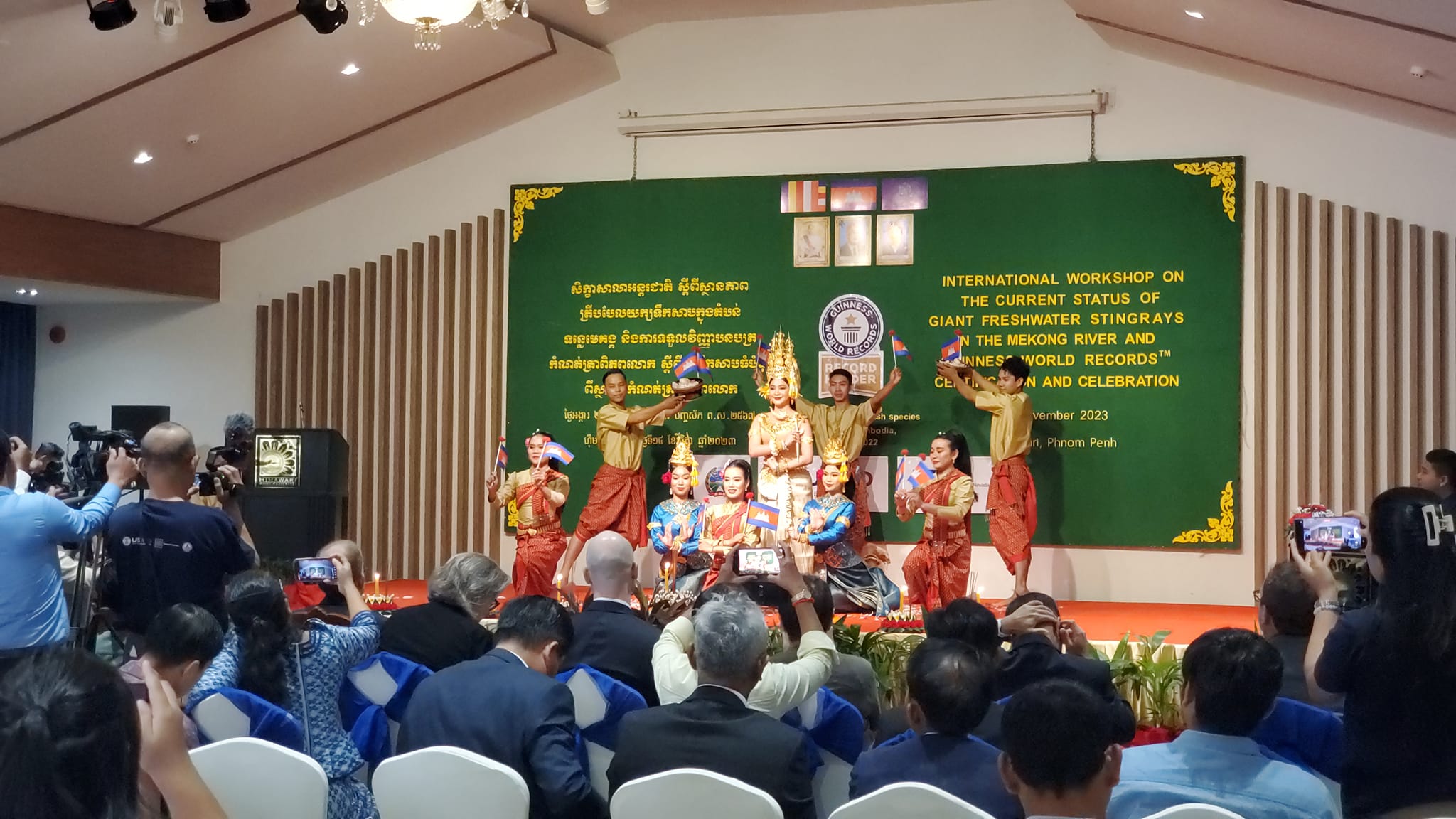 ភ្នំពេញ៖ មន្ត្រីជាន់ខ្ពស់ក្រសួងកសិកម្ម បានអញ្ជើញជាអ្នកតំណាងទទួលវិញ្ញាបនបត្រកំណត់ត្រាពិភពលោកស្តីពីត្រីទឹកសាបធំបំផុតរបស់កម្ពុជា ពីស្ថាប័នកំណត់ត្រាពិភពលោក (Guinness World Records) ខណៈដែលវិទ្យាស្ថានស្រាវជ្រាវ និងអភិវឌ្ឍណ៍ជលផលទឹកសាបនៃរដ្ឋបាលជលផល បានចូលរួមរៀបចំពិធីសិក្ខាសាលាថ្នាក់អន្តរជាតិស្តីពីស្ថានភាពត្រីបបែលយក្សទឹកសាបក្នុងតំបន់ទន្លេមេគង្គ នៅថ្ងៃទី១៤ ខែវិច្ឆិកា ឆ្នាំ២០២៣។