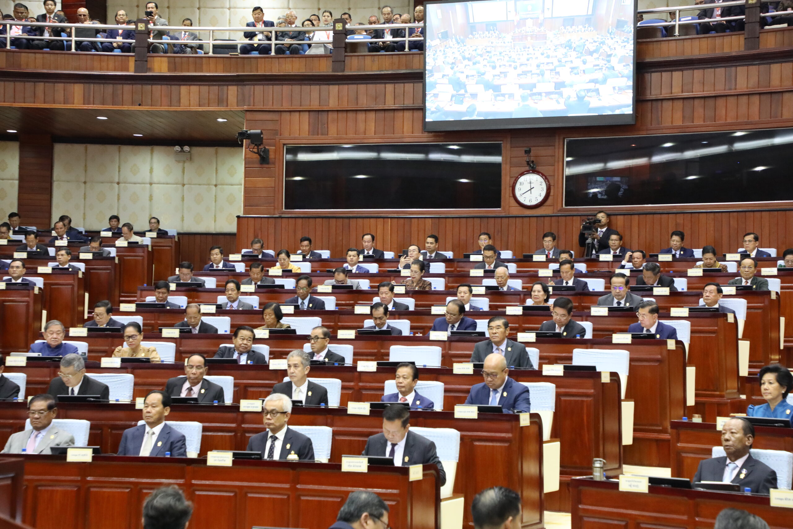ភ្នំពេញ៖ បន្ទាប់ពីបានពិភាក្សាយ៉ាងផុលផុសលើប្រធានបទទី១ -ស្ដីពី ប្រព័ន្ធគាំពារសង្គម ចាប់ពីព្រឹករហូតដល់ពេលរសៀល ថ្ងៃទី២ ខែមិថុនា ឆ្នាំ២០២៥ អង្គសមាជរដ្ឋសភា និងព្រឹទ្ធសភា បានគាំទ្រទាំងស្រុងនូវយុទ្ធសាស្រ្តដ៏ត្រឹមត្រូវរបស់រាជរដ្ឋាភិបាលក្នុងការអភិវឌ្ឍប្រព័ន្ធគាំពារសង្គម ដែលបានលើកកម្ពស់សុខុមាលភាព ជីវភាព ការអប់រំ និងសេវាសង្គមផ្សេងៗទៀតជូនប្រជាពលរដ្ឋដោយឈរលើស្មារតី “មិនបោះបង់ពលរដ្ឋណាម្នាក់” ។ អង្គប្រជុំសមាជរដ្ឋសភា និងព្រឹទ្ធសភា បានអនុម័តលើសេចក្តីសម្រេចស្ដីពីប្រព័ន្ធគាំពារសង្គមក្នុងសំឡេង១៨១សំឡេង លើ១៨១សំឡេង នៃចំនួនសមាជិកសមាជចូលរួមប្រជុំ។