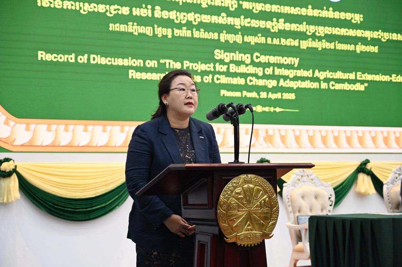 ឯកឧត្តម ឌិត ទីណា រដ្ឋមន្ត្រីក្រសួងកសិកម្ម រុក្ខាប្រមាញ់ និងនេសាទ និង លោកស្រី Choi Moonjung នាយិកាការិយាល័យកយកាប្រចាំប្រទេសកម្ពុជា បានចុះហត្ថលេខាលើកិច្ចព្រមព្រៀងនេះ នៅទីស្ដីការក្រសួងកសិកម្ម នាថ្ងៃទី២៨ ខែមេសា ឆ្នាំ២០២៥។