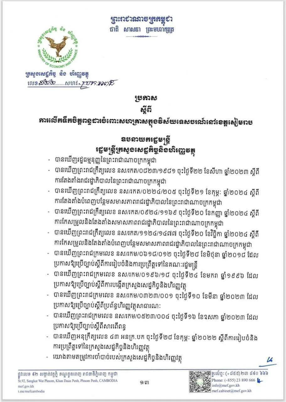 ភ្នំពេញ៖ រាជរដ្ឋាភិបាលកម្ពុជា តាមរយៈក្រសួងសេដ្ឋកិច្ច និងហិរញ្ញវត្ថុ ដែលជាសេនាធិការ បានចេញប្រកាសស្តីពីការលើកទឹកចិត្តពន្ធដារ ចំពោះបណ្តាសហគ្រាសក្នុងវិស័យទេសចរណ៍នៅខេត្តសៀមរាប រួមមានដូចជា សកម្មភាពអាជីវកម្មផ្នែកសណ្ឋាគារ ផ្ទះសំណាក់ ភោជនីយដ្ឋាន និងក្រុមហ៊ុនភ្នាក់ងារទេសចរណ៍ ដែលបានចុះបញ្ជីពន្ធដារ។