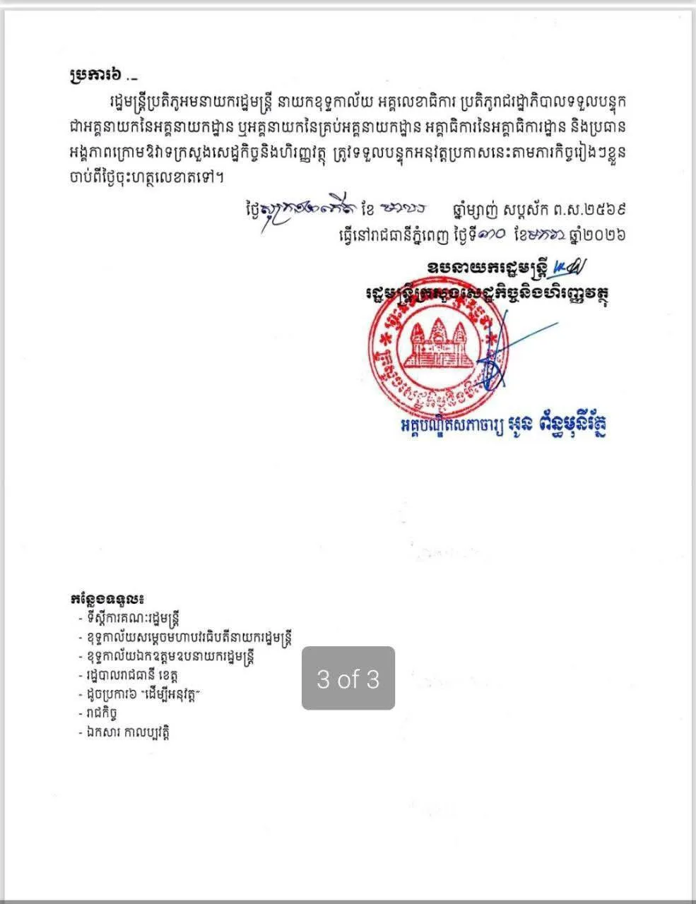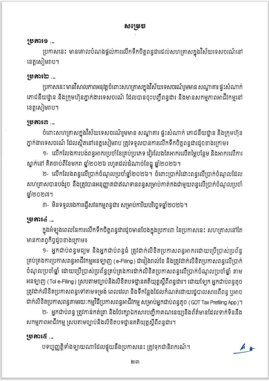 ១- លើកលែងការបង់ពន្ធអាករប្រចាំខែគ្រប់ប្រភេទ វៀរលែងតែអាករលើតម្លៃបន្ថែម និងអាករលើការស្នាក់នៅ គិតចាប់ពីខែមករា ឆ្នាំ២០២៦ រហូតដល់ដំណាច់ខែធ្នូ ឆ្នាំ២០២៦។