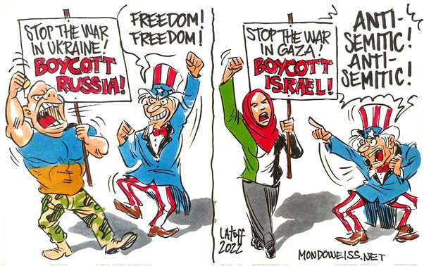ជាឧទាហរណ៍ជាក់ស្តែង ទោះបីជាចំនួនអ្នកស្លាប់នៅមន្ទីរពេទ្យ Al Ahli Baptish នៅហ្គាហ្សាមានចំនួនច្រើនជាងចំនួនអ្នកស្លាប់នៅមន្ទីរពេទ្យក្នុងទីក្រុង Mariupol កាលពីខែមិនាឆ្នាំ២០២២កន្លងទៅក្តី ប៉ុន្តែអាមេរិក និងលោកខាងលិចនាំគ្នាស្តីបន្ទោសយ៉ាងខ្លាំងចំពោះប្រទេសរុស្សីជាជាងការថ្កោលទោសចំពោះអ៊ីស្រាអែល។