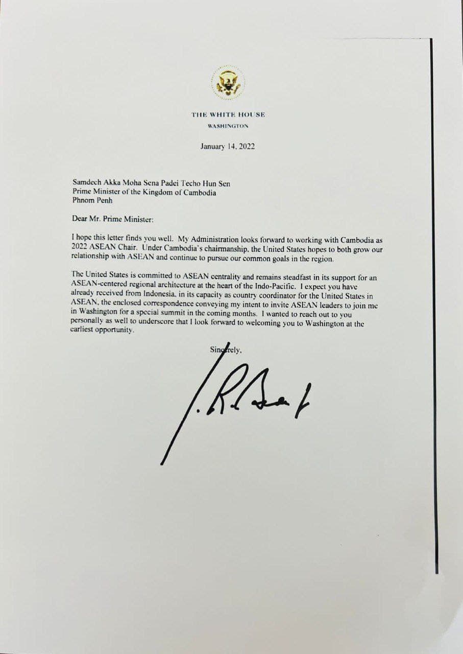 ភ្នំពេញ៖ ប្រធានាធិបតីសហរដ្ឋអាមេរិក លោក ចូ បៃឌិន បានផ្ញើសារលិខិតជាផ្លូវការចេញពីសេតវិមាន នៃរដ្ឋធានីវ៉ាស៊ីនតោន សហរដ្ឋអាមេរិក ដោយបង្ហាញពីគោលបំណងអញ្ជើញសម្ដេចអគ្គមហាសេនាបតីតេជោ ហ៊ុន សែន នាយករដ្ឋ មន្ត្រីនៃព្រះរាជាណាចក្រកម្ពុជា ព្រមទាំង ថ្នាក់ដឹកនាំកំពូលអាស៊ាន ចូលរួម នៅក្នុងកិច្ចប្រជុំពិសេស អាស៊ាន-សហរដ្ឋអាមេរិក ដែលនឹងប្រារព្ធនៅពេលឆាប់ៗខាងមុខនេះ។