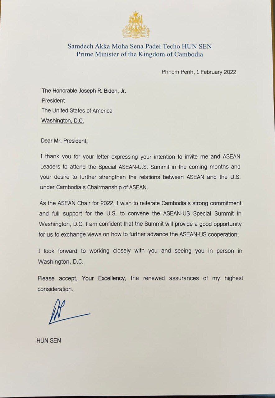 ខ្ញុំសូមអរគុណ ឯកឧត្តមប្រធានាធិបតី ដែលបានផ្ញើលិខិតបញ្ជាក់អំពីគោលបំណងរបស់ឯកឧត្តមអញ្ជើញខ្ញុំ និងថ្នាក់ដឹកនាំអាស៊ាន ចូលរួមកិច្ចប្រជុំកំពូលពិសេសអាស៊ាន-សហរដ្ឋអាមេរិក ដែលគ្រោងរៀបចំនៅក្នុងរយៈពេលប៉ុន្មានខែខាងមុខនេះ និងបំណងប្រាថ្នាក្នុងការពង្រឹងទំនាក់ទំនង អាស៊ាន-សហរដ្ឋអាមេរិក បន្ថែមទៀត ក្នុងពេលកម្ពុជាធ្វើជាប្រធានអាស៊ាន ។