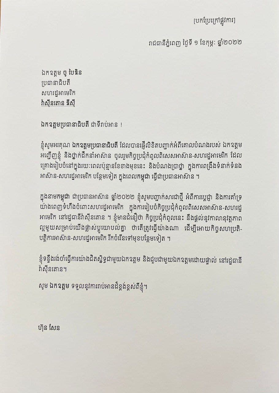 ខ្ញុំសង្ឃឹមថា សម្តេចតេជោនាយករដ្ឋមន្ត្រី បានប្រកបដោយសុខភាពល្អនៅពេលទទួលបានលិខិតនេះ។ រដ្ឋបាលរបស់ខ្ញុំ (ទន្ទឹងរង់ចាំធ្វើការជាមួយកម្ពុជាក្នុងនាមជាប្រធានអាស៊ានសម្រាប់ឆ្នាំ២០២២។ ក្រោមភាពជាប្រធានអាស៊ារបស់កម្ពុជា (សហរដ្ឋអាមេរិកសង្ឃឹមថាទំនាក់ទំនងអាស៊ាន-សហរដ្ឋអាមេរិក នឹងកាន់តែរីកចម្រើន និងបន្តឆ្ពោះទៅសម្រេចគោលដៅរួមរបស់យើងនៅក្នុងតំបន់។