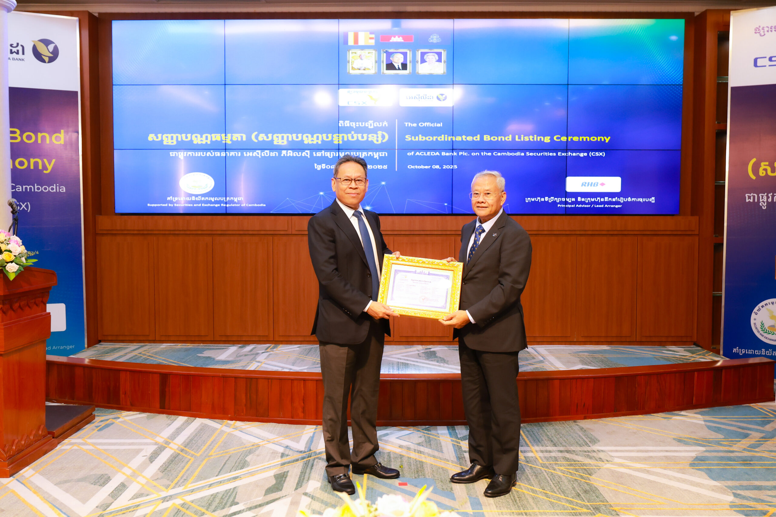 ភ្នំពេញ ៖ ផ្សារមូលបត្រកម្ពុជា និងធនាគារអេស៊ីលីដា ភីអិលស៊ី បានប្រកាសជាផ្លូវការចុះបញ្ជីលក់សញ្ញាបណ្ណបន្ទាប់បន្សំរបស់ធនាគារអេស៊ីលីដាជាលើកទី២ ក្នុងទំហំទឹកប្រាក់ប្រមាណ៤០០ពាន់លានរៀល ឬស្មើនឹងប្រមាណ ១០០លានដុល្លារអាម៉េរិក ។