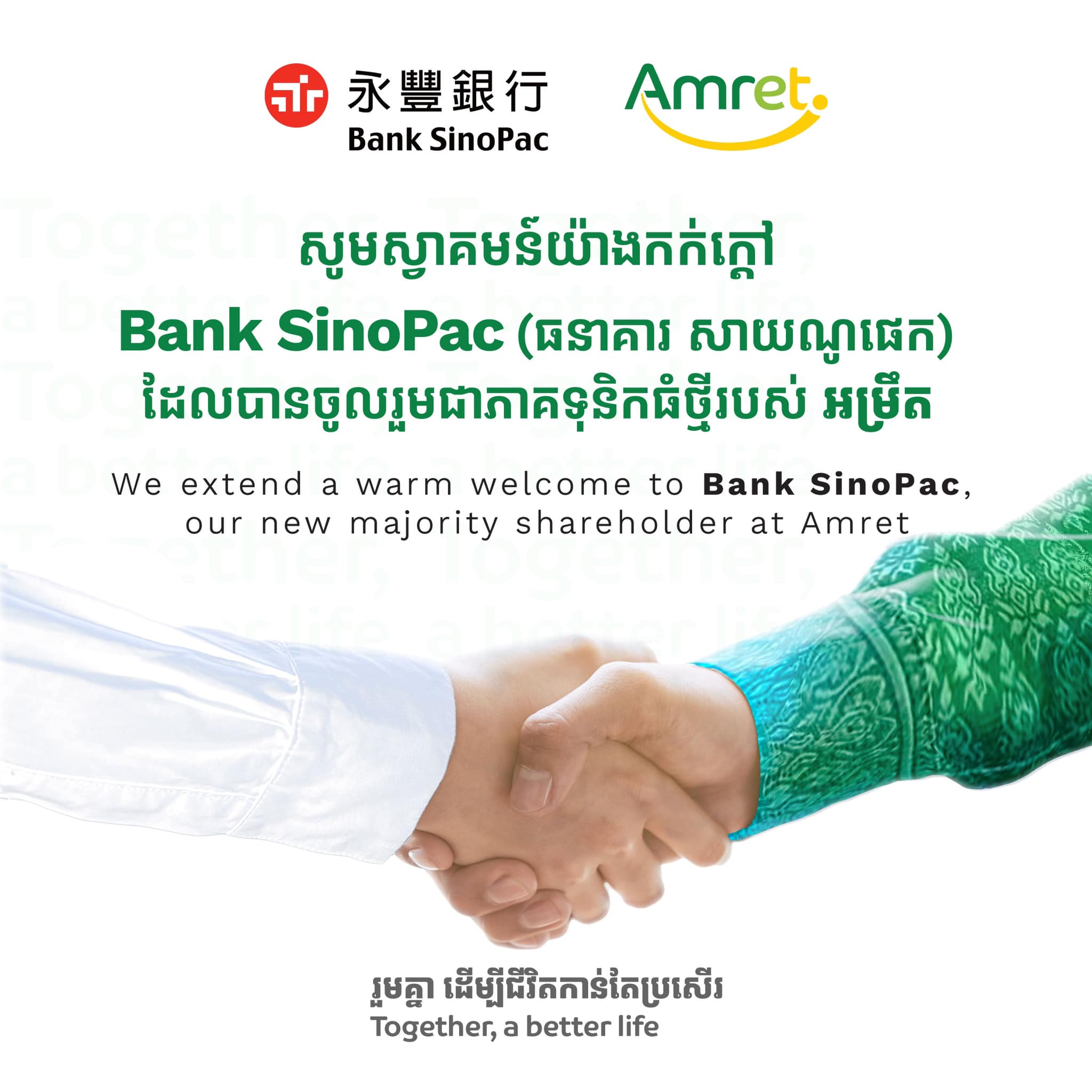 តាមរយៈសេចក្ដីប្រកាសដដែលបានបញ្ជាក់ថា គ្រឹះស្ថានមីក្រូហិរញ្ញវត្ថុ អម្រឹត ម.ក មានសេចក្តីសោមនស្សរីករាយសូមធ្វើការប្រកាសជម្រាបជូនសាធារណជនមេត្តាជ្រាបថា៖ BankSinoPac(ធនាគារ សាយណូផេក)មកពីកោះតៃវ៉ាន់បានបិទបញ្ចប់ជាស្ថាពរដោយជោគជ័យនូវដំណើរការទិញយកភាគហ៊ុនចំនួន៨០%នៅក្នុងអម្រឹត បន្ទាប់ពីទទួលបានការអនុញ្ញាតជាផ្លូវការពីអាជ្ញាធរអាណាព្យាបាលពាក់ព័ន្ធនានារបស់ស្ថាប័នទាំងពីរ។