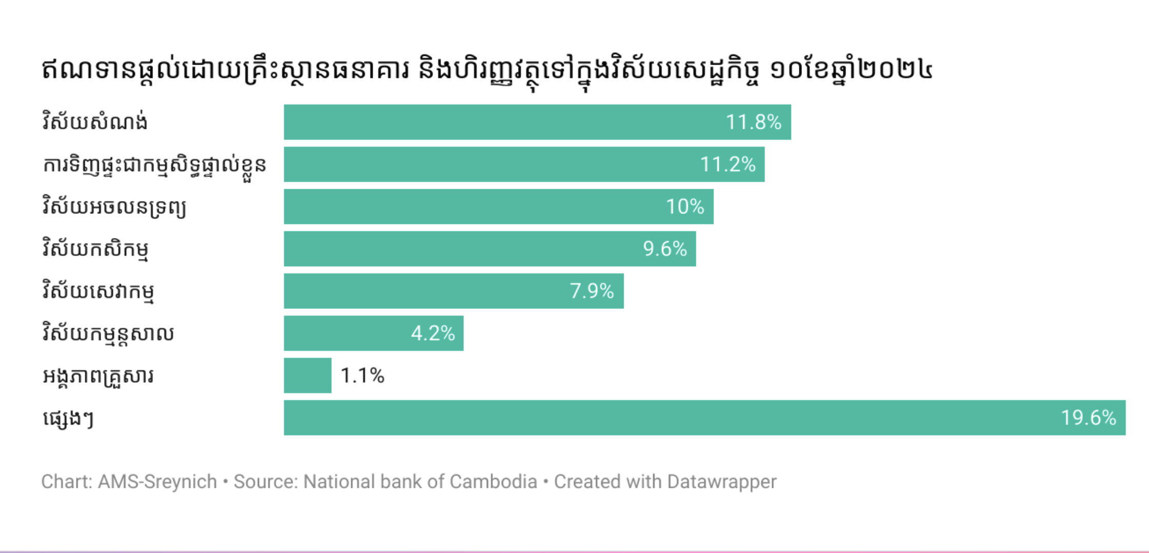 បើតាមការចុះផ្សាយរបស់ធនាគារជាតិបានឱ្យដឹងថា វិស័យសំខាន់ៗដែលគ្រឹះស្ថានធនាគារ និងហិរញ្ញវត្ថុបានផ្ដល់ក្នុងរយៈពេល១០ខែកន្លងមកនេះរួមមាន៖ ការជួញដូរដុំ និងរាយ គិតជាទឹកប្រាក់ចំនួន ៦០.៩២ប៊ីលានដុល្លារ (ស្មើនឹង ២៤,៦%), វិស័យសំណង់ គិតជាទឹកប្រាក់ចំនួន ២៩.១៩ ប៊ីលានដុល្លារ (ស្មើនឹង ១១,៨%)។