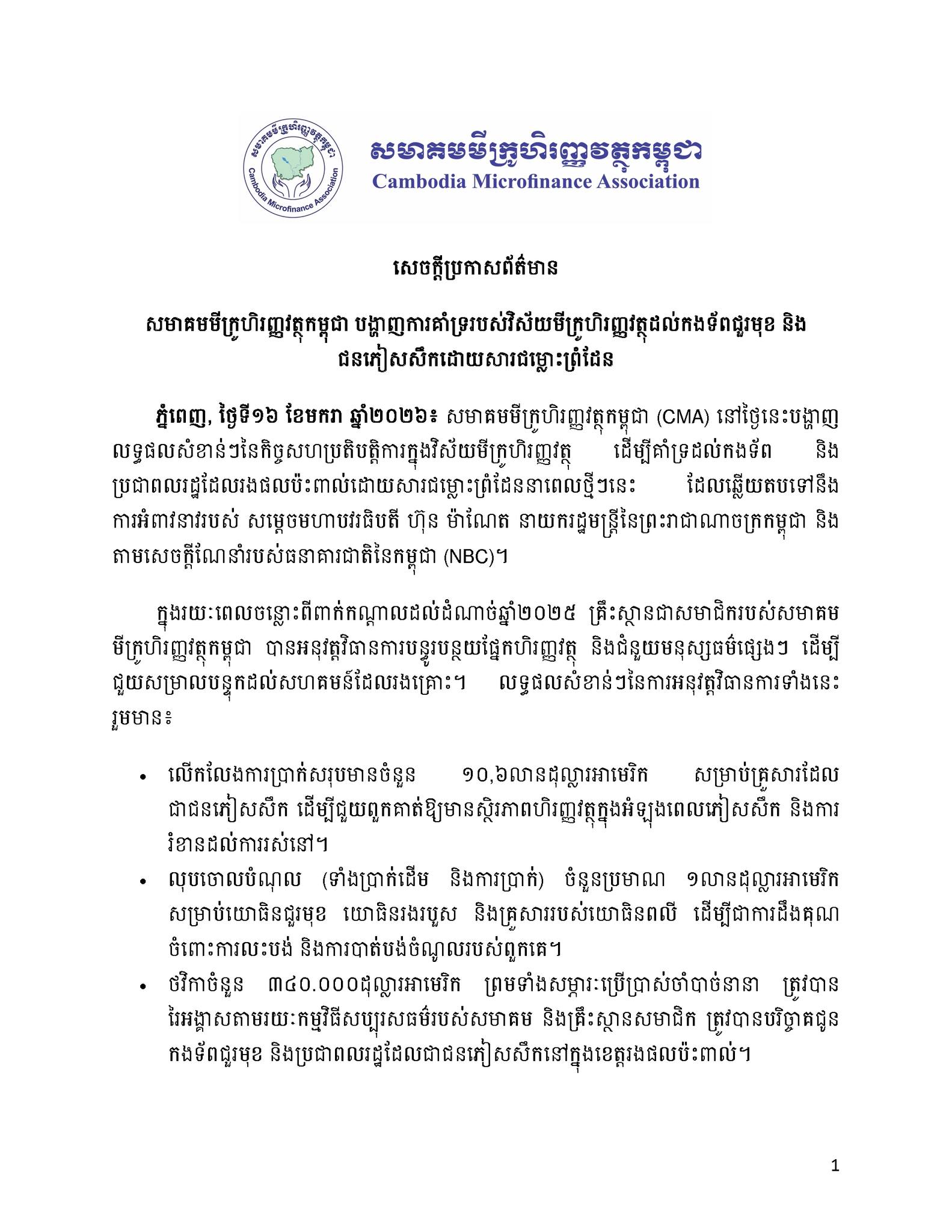 ភ្នំពេញ ៖ សមាគមមីក្រូហិរញ្ញវត្ថុកម្ពុជា (CMA) នៅថ្ងៃទី១៦ ខែមករា ឆ្នាំ២០២៦នេះ បង្ហាញលទ្ធផលសំខាន់ៗនៃកិច្ចសហប្រតិបត្តិការក្នុងវិស័យមីក្រូហិរញ្ញវត្ថុ ដើម្បីគាំទ្រដល់កងទ័ព និងប្រជាពលរដ្ឋដែលរងផលប៉ះពាល់ដោយសារជម្លោះព្រំដែននាពេលថ្មីៗនេះ ដែលឆ្លើយតបទៅនឹងការអំពាវនាវរបស់ សម្តេចមហាបវរធិបតី ហ៊ុន ម៉ាណែត នាយករដ្ឋមន្រ្តីនៃព្រះរាជាណាចក្រកម្ពុជា និងតាមសេចក្តីណែនាំរបស់ធនាគារជាតិនៃកម្ពុជា (NBC)។