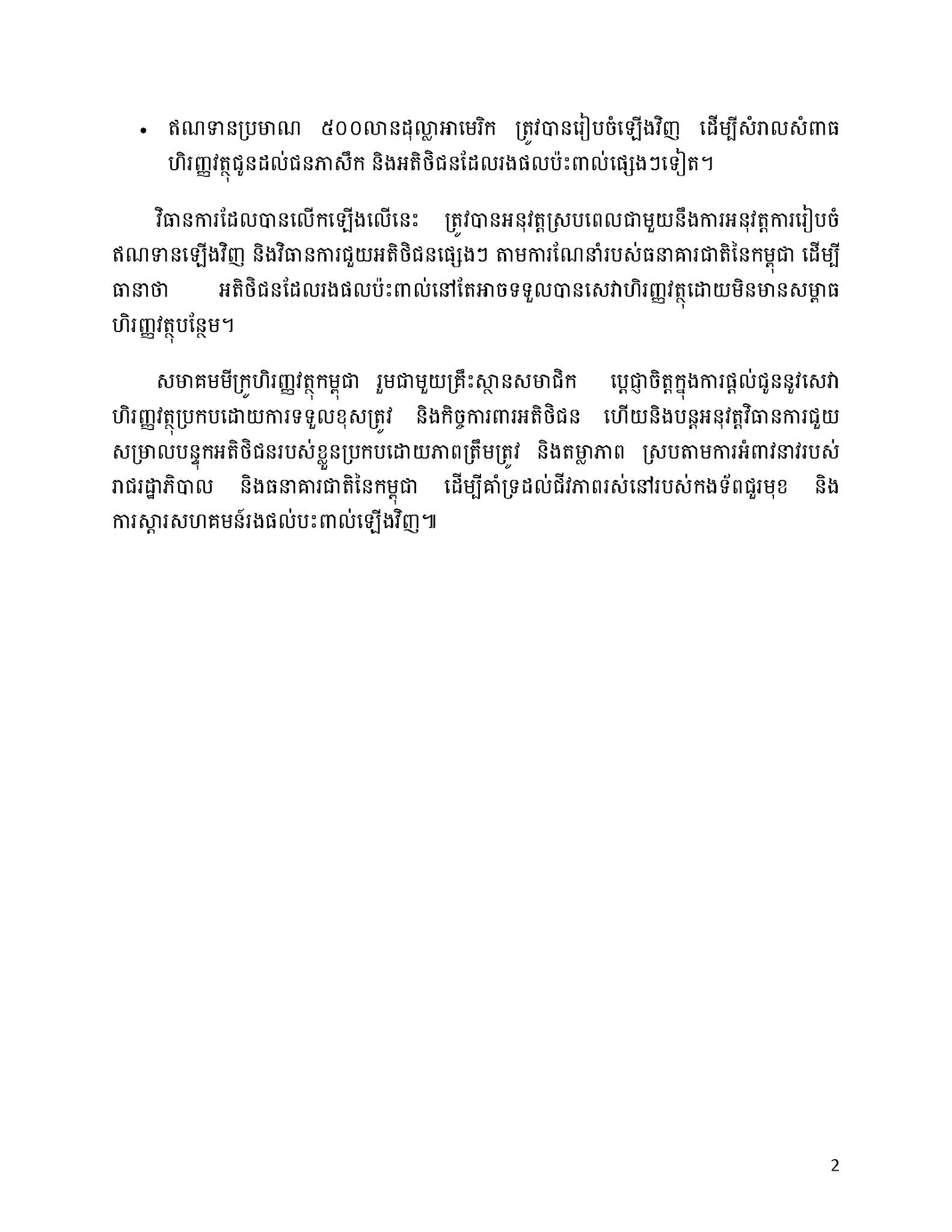វិធានការដែលបានលើកឡើងលើនេះ ត្រូវបានអនុវត្តស្របពេលជាមួយនឹងការអនុវត្តការរៀបចំឥណទានឡើងវិញ និងវិធានការជួយអតិថិជនផ្សេងៗ តាមការណែនាំរបស់ធនាគារជាតិនៃកម្ពុជា ដើម្បីធានាថា អតិថិជនដែលរងផលប៉ះពាល់នៅតែអាចទទួលបានសេវាហិរញ្ញវត្ថុដោយមិនមានសម្ពាធហិរញ្ញវត្ថុបន្ថែម។